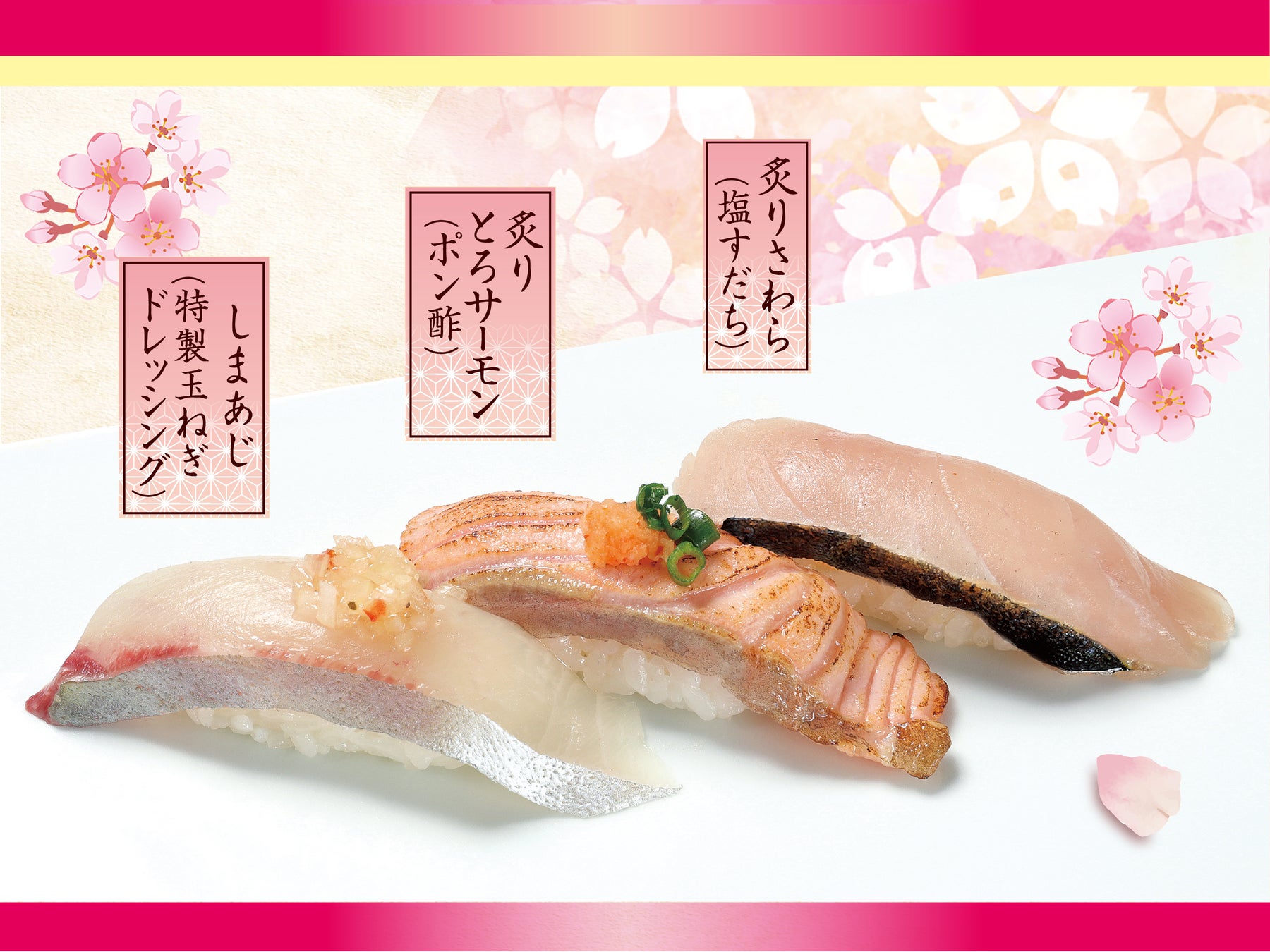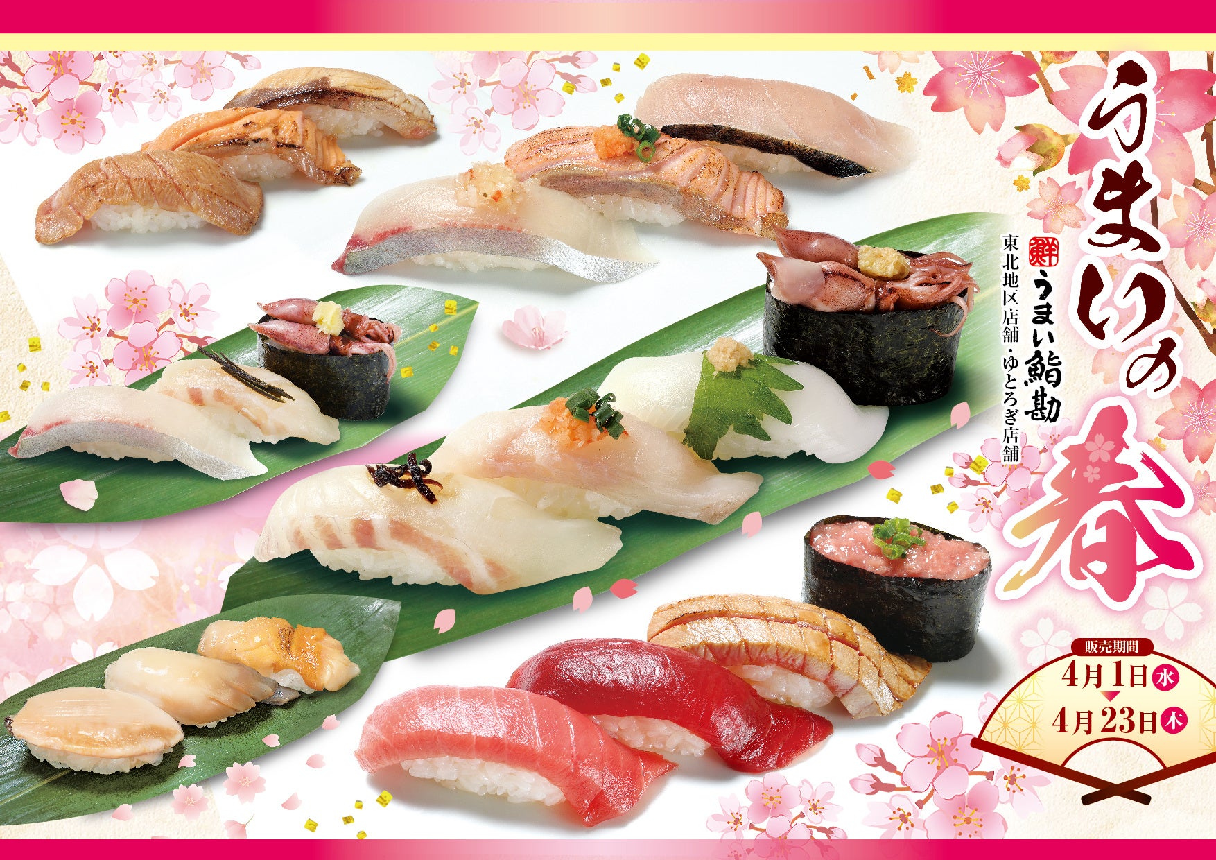 桜が満開を迎えるこの時期、春らしい旬のお寿司はいかがですか?うまい鮨勘では、回転寿司店舗・ゆとろぎ店舗、東北対面寿司店舗それぞれの業態で、この時期限定のネタを取り揃えたメニューを販売いたします。