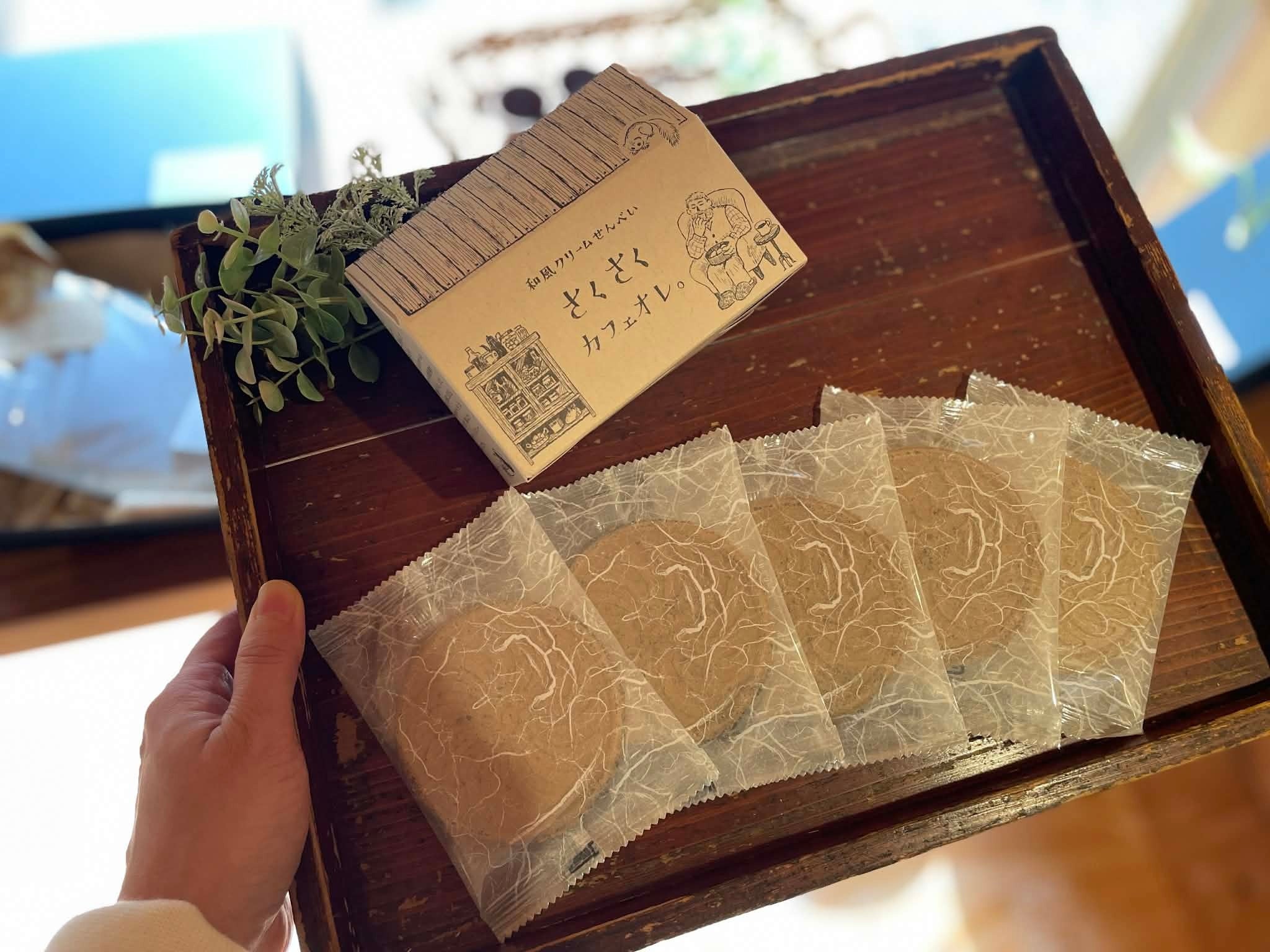 「さくさくカフェオレ。」は、「森とコーヒー。」の珈琲豆を練り込んだ生地でカフェオレ風味のクリームを挟んだ、贅沢な珈琲風味和風せんべいです。