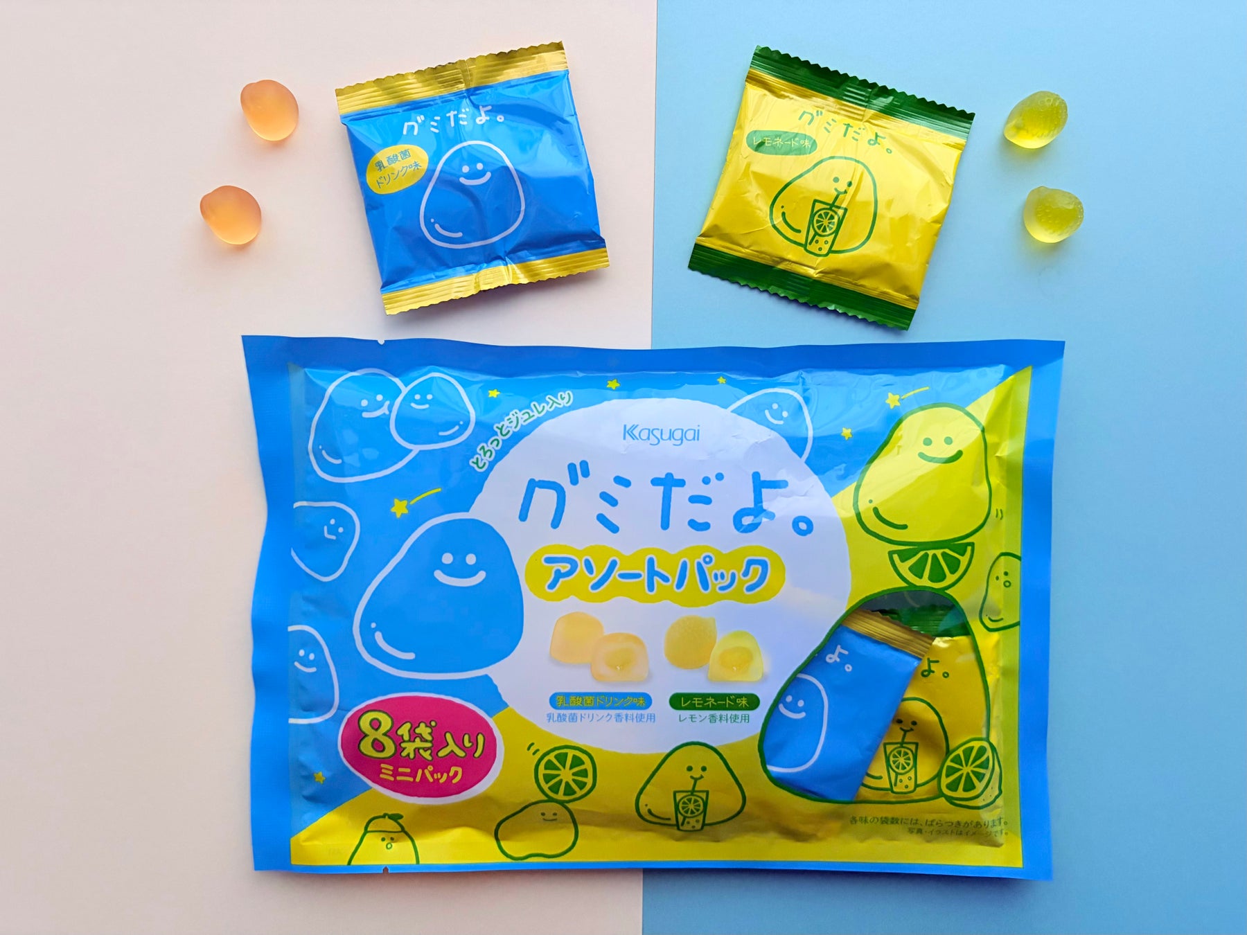 ジュレの入ったぷにとろ食感の2層構造グミと、キャラクターを中心としたゆる~い世界観が特長の「グミだよ。」から、“2種類が1袋で楽しめる『グミだよ。アソートパック』が登場。気分に合わせて味を選べる楽しさに加え、配りやすく持ち歩きにも便利な個包装タイプになっています。
