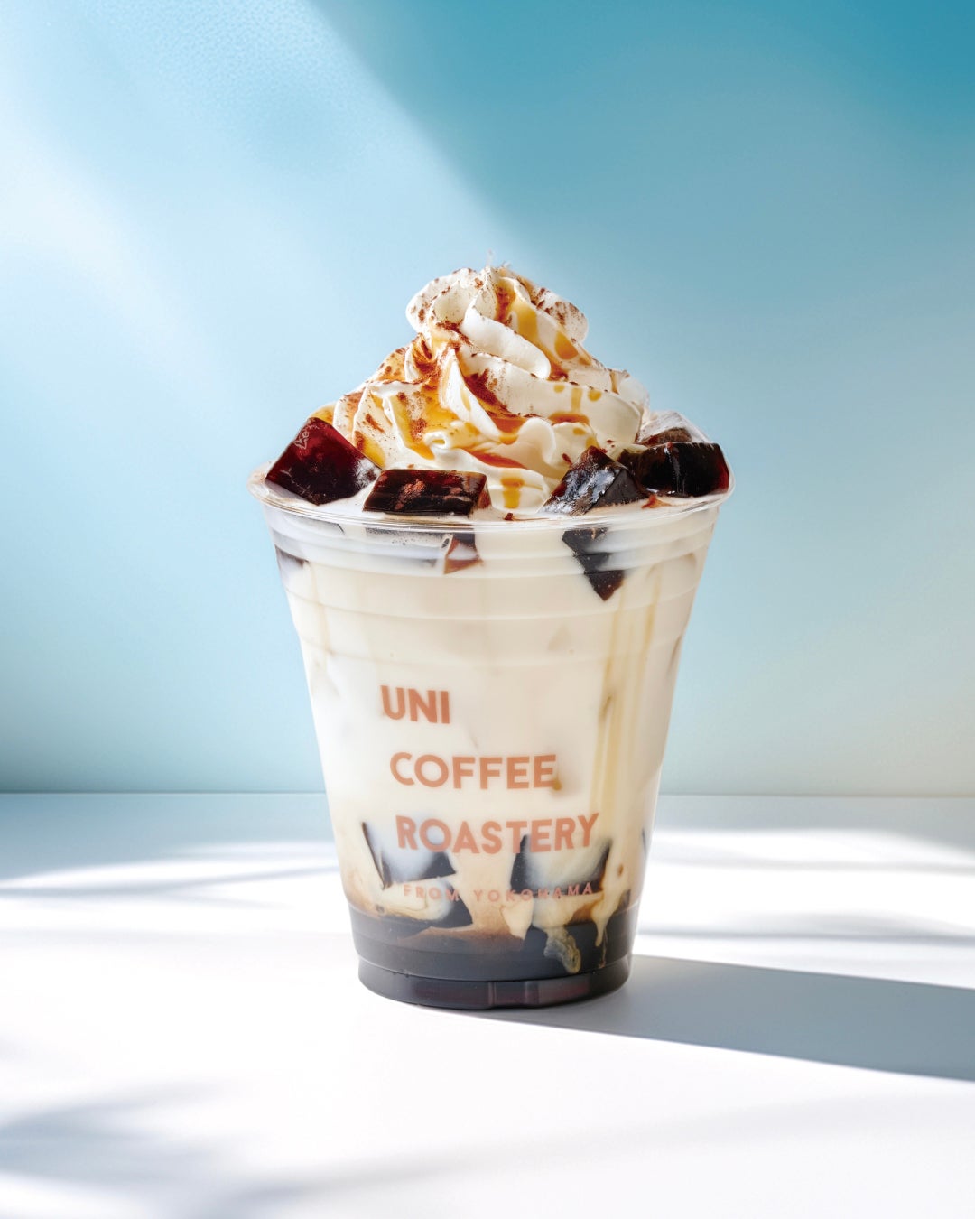 ホワイトチョコレートのまろやかなミルクにコーヒーゼリーを重ね、ホイップクリームとココアパウダー、キャラメルソースで仕上げました。 甘さとほろ苦さが織りなすメロディが、心を優しく満たしてくれる一杯です。