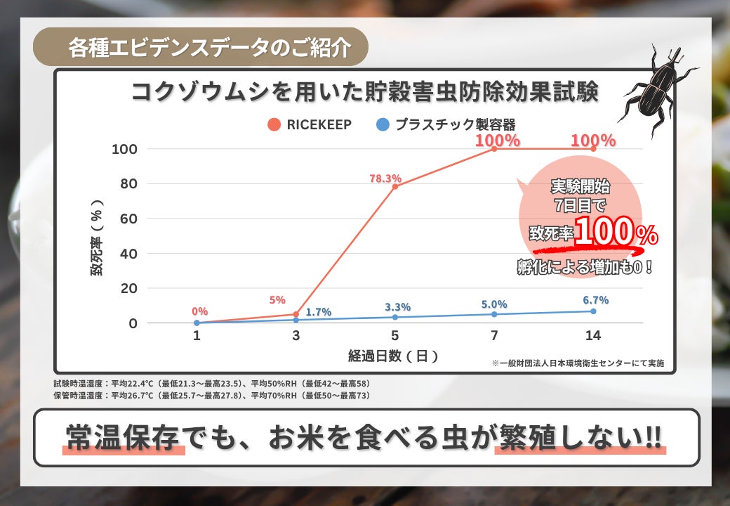 第三者機関による試験において、袋内に封入したコクゾウムシが7日後に確認されなくなり、その後の卵からの孵化も確認されない結果が得られました。