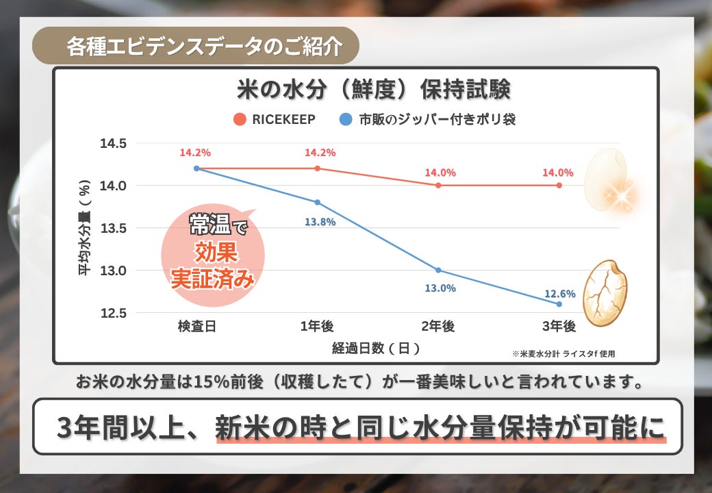 米麦水分計による計測では、同性能商品プロガードライスキープに入れて実験。約3年間の保存期間でも白米に含まれる水分量がほとんど下がっていないことが判明しました。