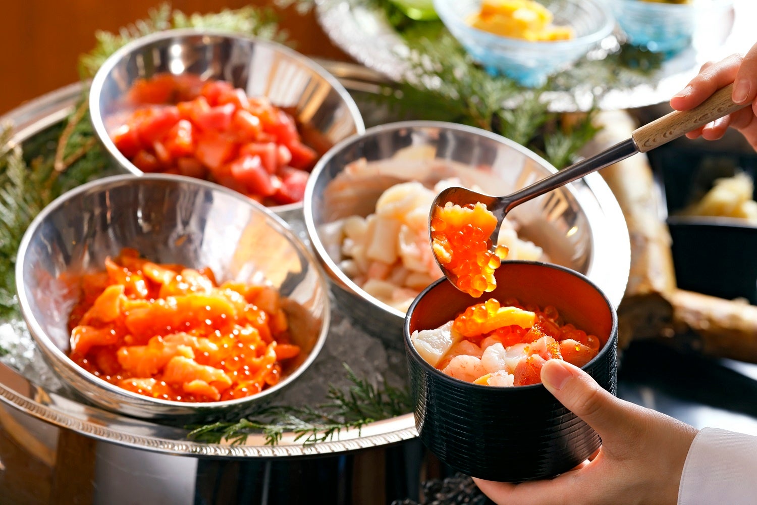 好きな具材を自由に組み合わせて、自分だけのオリジナル丼作りを楽しめます。サーモンやイクラ、漬けマグロなどの魚介に加え、玉子焼きや薬味をお好みでトッピング。組み合わせ次第で、見た目も味わいも自分だけの一杯に仕上がります。