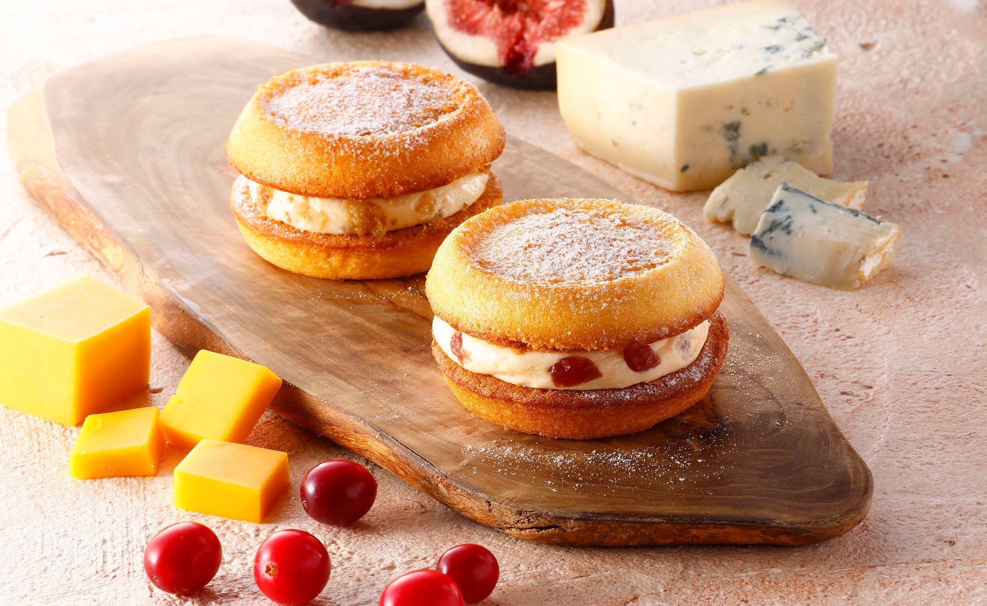 チーズフルーツバーガー。ご主人自慢のチーズの薫りと森の果実を贅沢に使用し、クリームチーズを練り込んだしっとり生地でサンドしました。