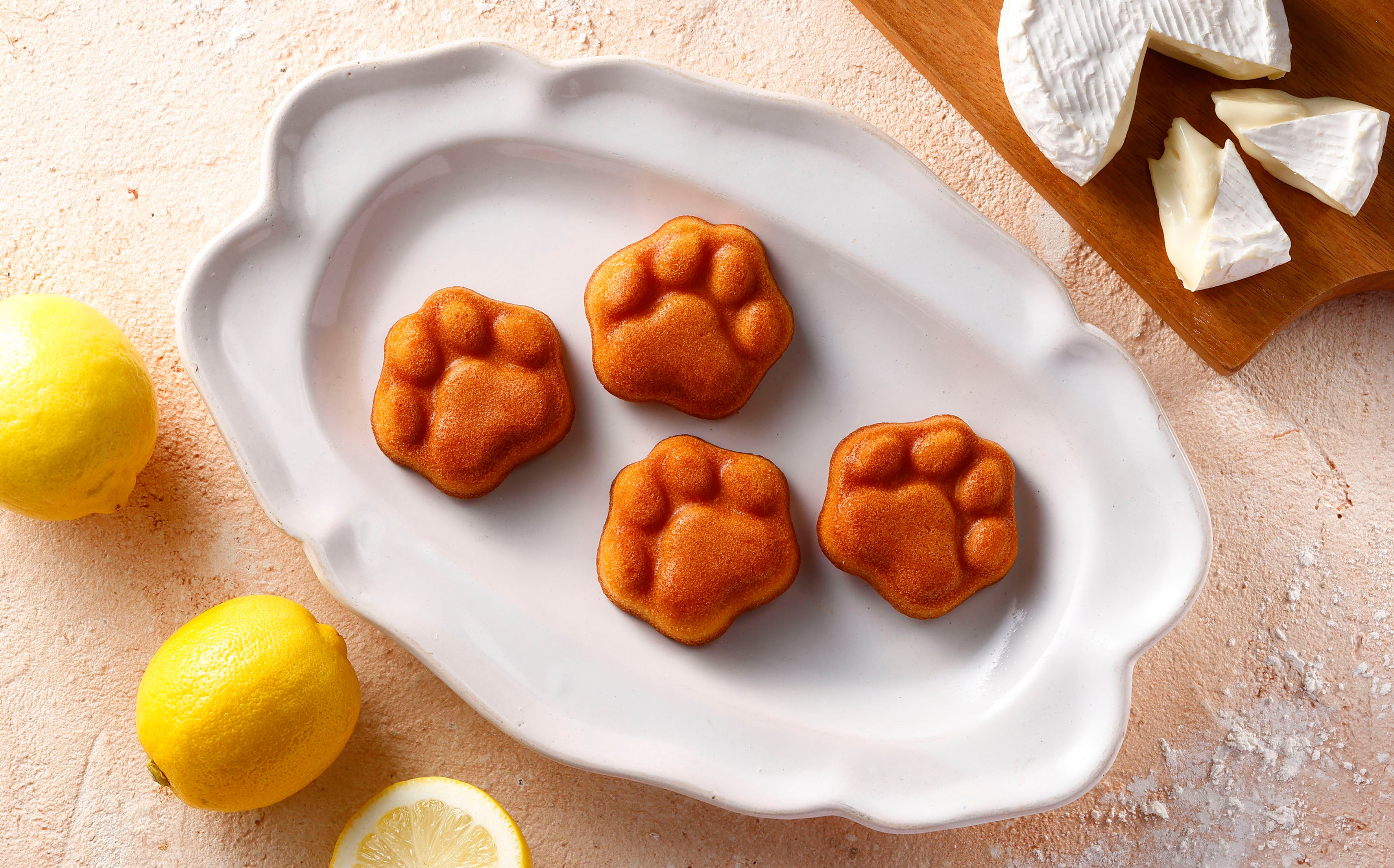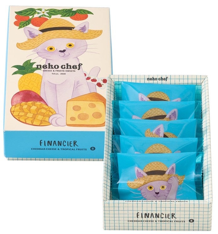 チェダーチーズを練り込んだ生地に、パインやマンゴーなどトロピカルフルーツの爽やかな風味とオレンジピールを忍ばせ、しっとり肉球型に焼き上げました。ココナッツのシャリッと食感が、さりげないアクセントに。甘さと塩味、チーズのコクとフルーツの爽やかさが心地よく重なる、ネコシェフこだわりのフィナンシェです