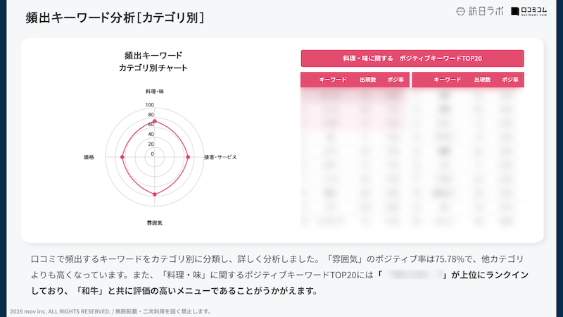 「料理・味」に関するポジティブキーワードTOP20では、「◯◯」「◯◯◯」などのキーワードが上位にランクインしており、お客様からの評価が高いメニューであることがうかがえます。