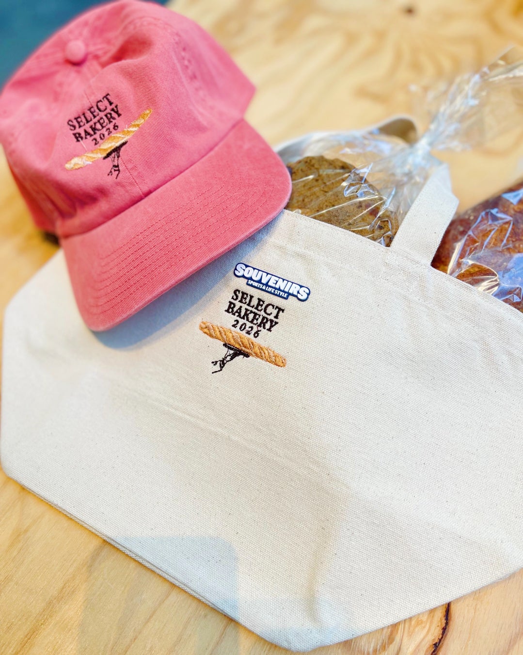 スポーツ&ライフスタイルショップ「SOUVENIRS」協力のもと、セレクトベーカリー限定のオリジナルキャップ&トートバッグが登場!かわいいパンのロゴが入ったグッズを身に着けて、パンのある暮らしをもっと楽しく。