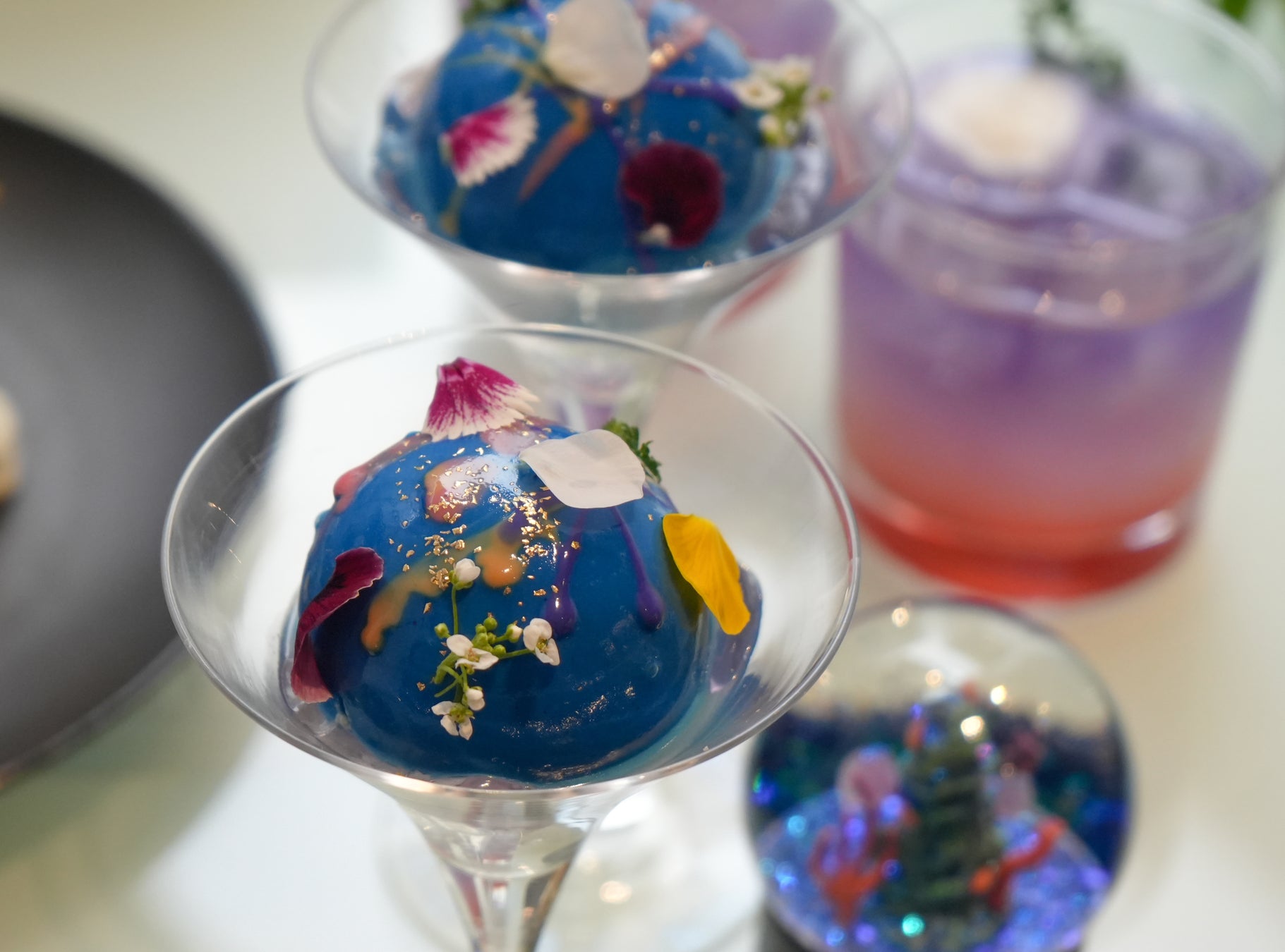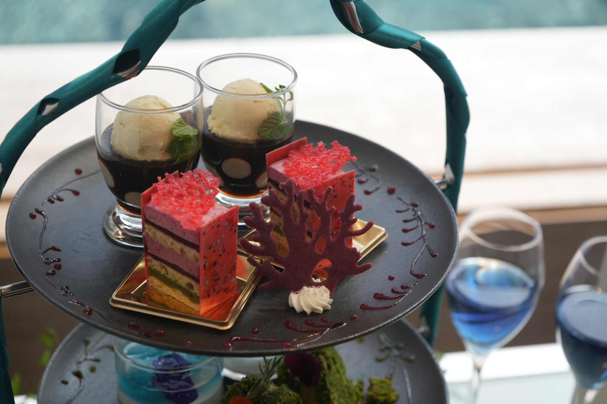 特に注目いただきたいのは、アトアの展示を華やかに表現した『PLANETS-奇跡の惑星-』のシンボリックな球体水槽から着想を得たブルーのムースケーキと『MIYABI-和と灯の間』をイメージした真っ赤なさくらんぼケーキです。見た目の美しさはもちろん、味わいのバランスや食感の変化など細部までこだわりが詰まったスイーツやセイボリーは、ゆったりとアトアの世界感を感じながら、特別なひとときをお楽しみいただけます。