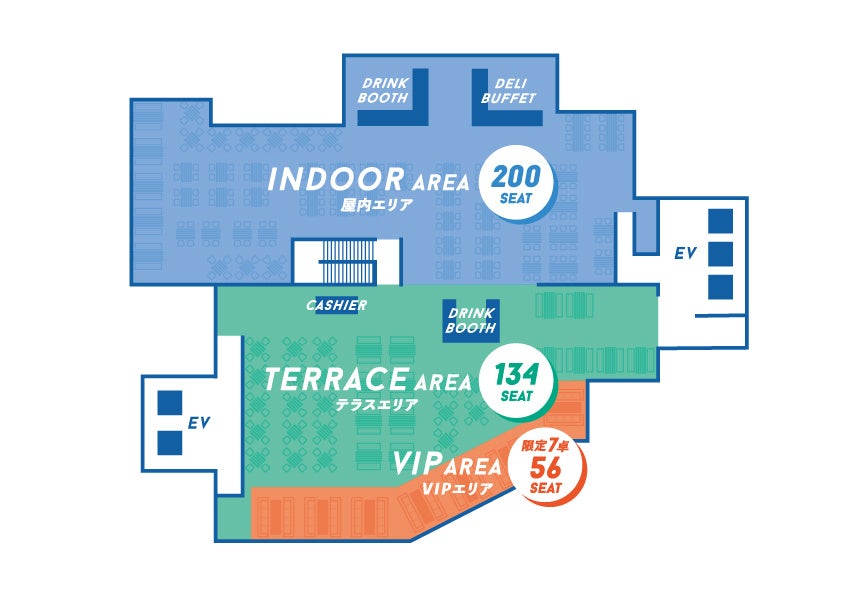 ●席数:全390席(屋内席:200席、テラス席:134席、VIP席:56席)