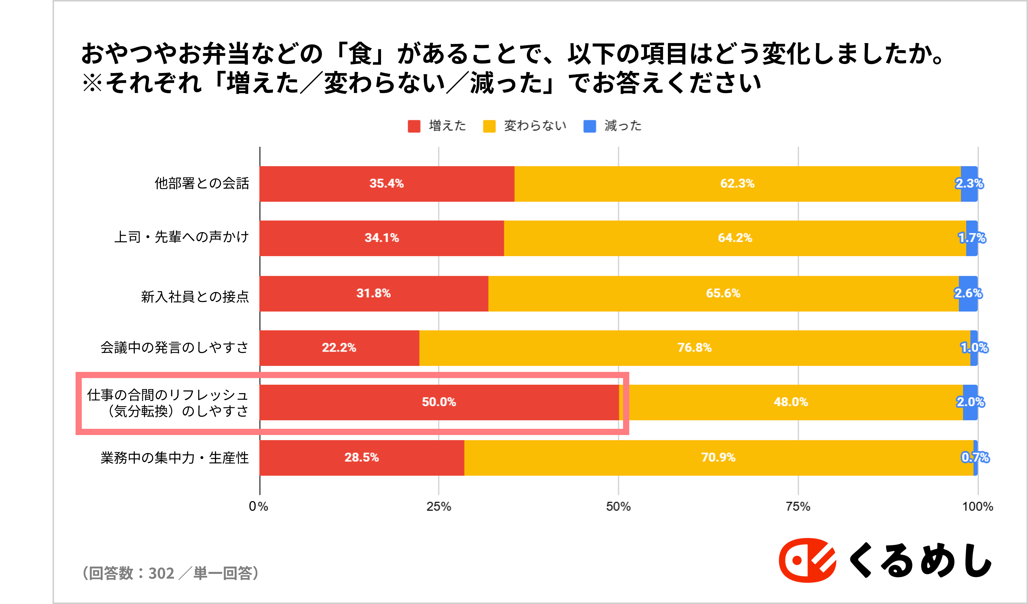 「共食」の機会があることによる影響については、「仕事の合間のリフレッシュ(気分転換)のしやすさ」の項目において「増えた」という回答が最も多く、50%に上りました。