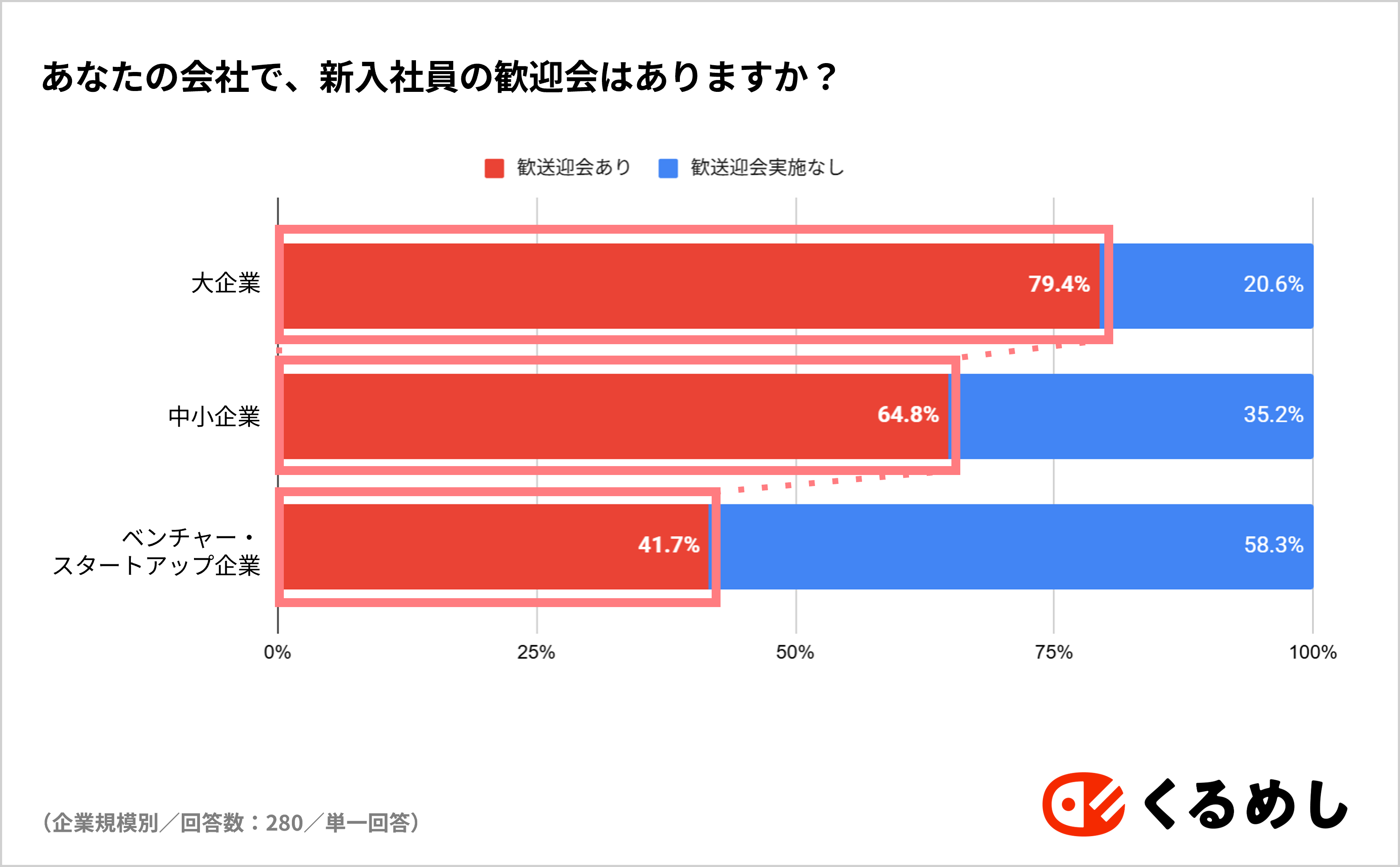 – 企業規模別にみると、同僚や上司と一緒に食事や軽食をとる慣習(共食)が最も多いのはベンチャー企業で71%