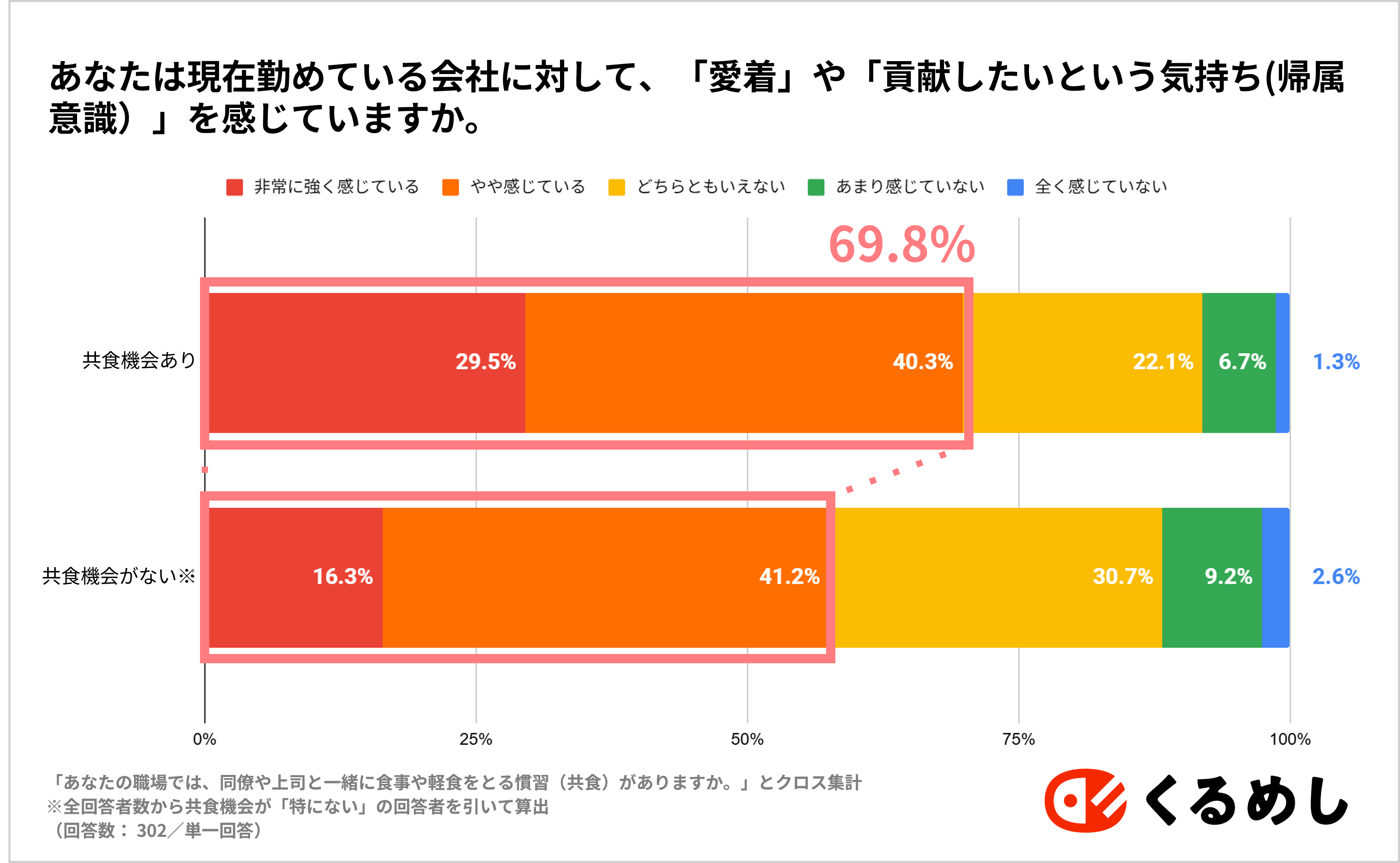 同僚や上司と一緒に食事や軽食をとる慣習「共食」の機会がある人に現在お勤めの会社に対して、「愛着」や「貢献したいという気持ち(帰属意識)」を感じているか伺ったところ、「非常に強く感じている(29.5%)」「やや感じている(40.3%)」と、合計で69.8%が愛着・帰属意識をもっていることがわかりました。