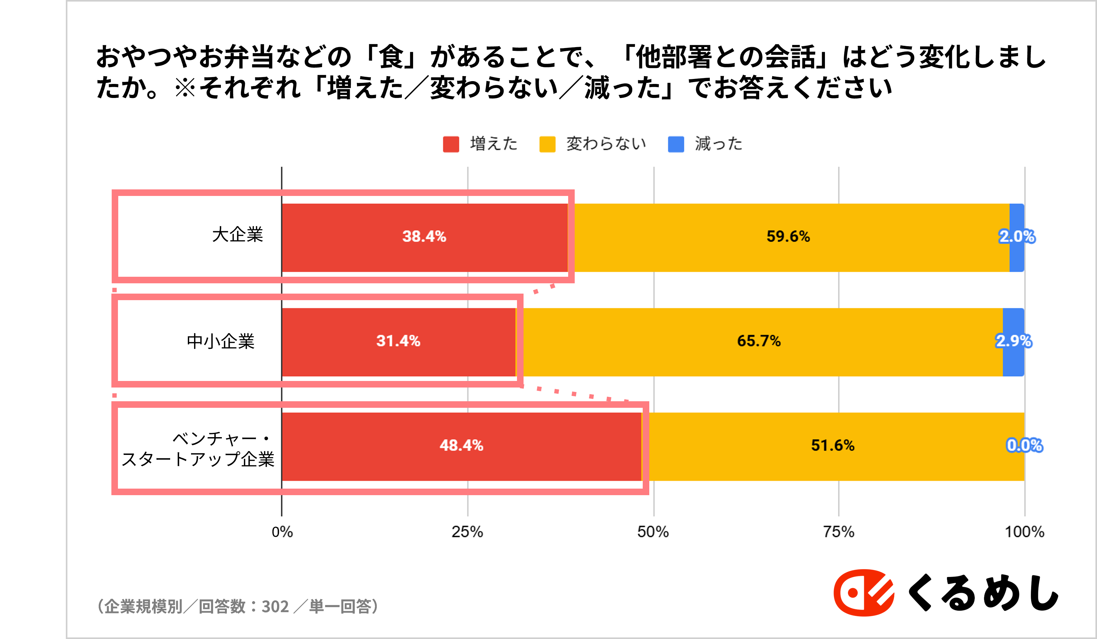 さらに、企業規模別で変化をみると、ベンチャー・スタートアップ企業において「他部署との会話が増えた」という項目が48.4%と、大企業・中小企業と比較し最も高い結果となりました。