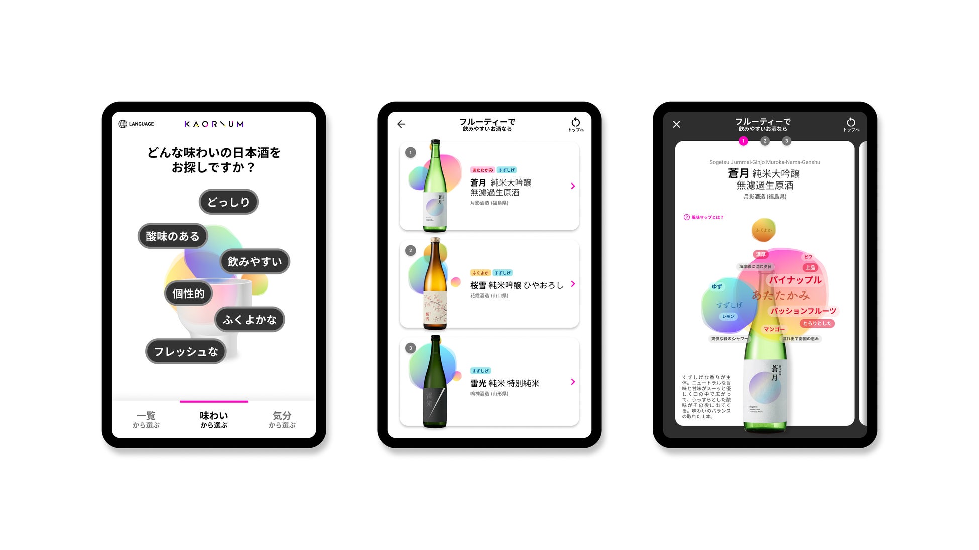 ソムリエAI「KAORIUM for Sake&Wine」は、日本酒の風味を言葉で可視化し、理想のお酒との出会いを導くことで、新たな飲食体験を実現するAIシステムです。言語表現が難しいお酒の風味をわかりやすい言葉で表現できる他、「解放されたい」「ワクワクしたい」といったなりたい気分や、「個性的」「フルーティ」といった好みの味わいに合わせて、AIが店頭にあるお酒とのマッチ度を解析し、自分に合ったお酒をレコメンドします。
