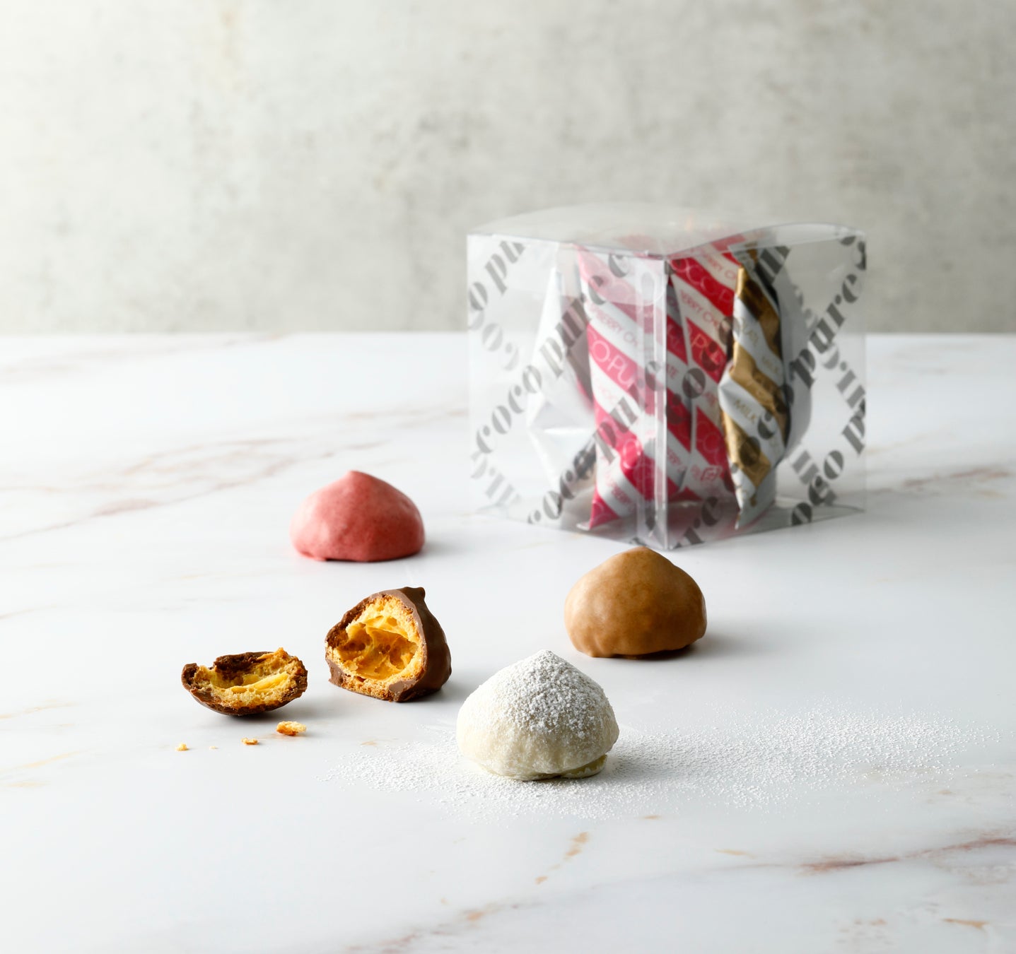 チーズ風味のサクサクのシュー生地に、チョコレートなどをまとわせた「ピュアココ」をはじめ、シャンパンやワインともあう「ピュアココ オリーブ」、2種類のフリーズドライフルーツにホワイトチョコレートを染み込ませた「ショコラフルーツ」、ハイブリッドスイーツ「ブルッキー」を販売します。