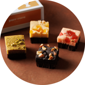 ブラウニーとクッキーの異なる魅力を一度に味わえる新感覚のハイブリッドスイーツです。ナッツの食感やフルーツの香り、優しい酸味など多彩な素材のハーモニーが楽しめる、華やかな彩りとキューブ型が愛らしい一品です。
