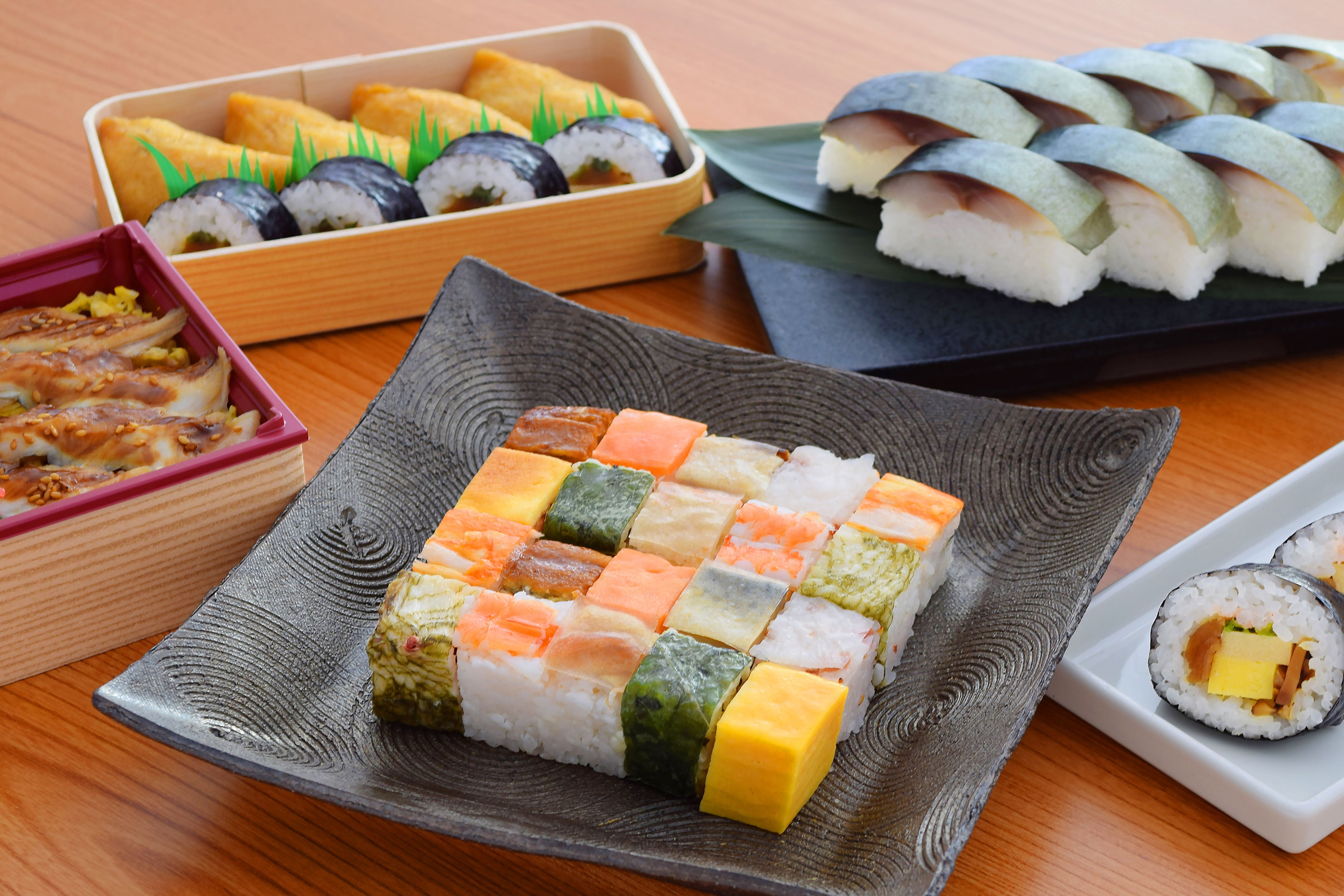 こだわりはオリジナルの合わせ酢を使ったしゃりと、自社で炊きあげた干瓢、椎茸、高野豆腐などの多彩な具材です。店の原点ともいえる「びっくりいなり」をはじめ、十二種類もの具材を彩り鮮やかにまとめた「うず潮巻」、季節の旬の食材を使った「ちらし寿司」「寿司弁当」、そして「鯖棒寿司」など、素朴な味わいのお寿司から個性豊かなオリジナル寿司やおむすびまで、日々の食卓に“彩りのあるひととき”を提供してまいります。