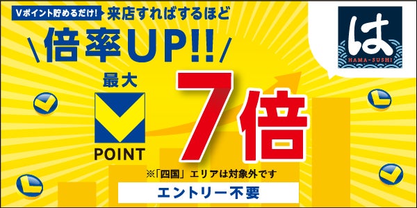 「はま寿司」では、来店回数に応じて最大7倍のVポイントを進呈いたします。キャンペーン期間中に2回来店で5倍、3回以上の来店で7倍のVポイントが貯まります。