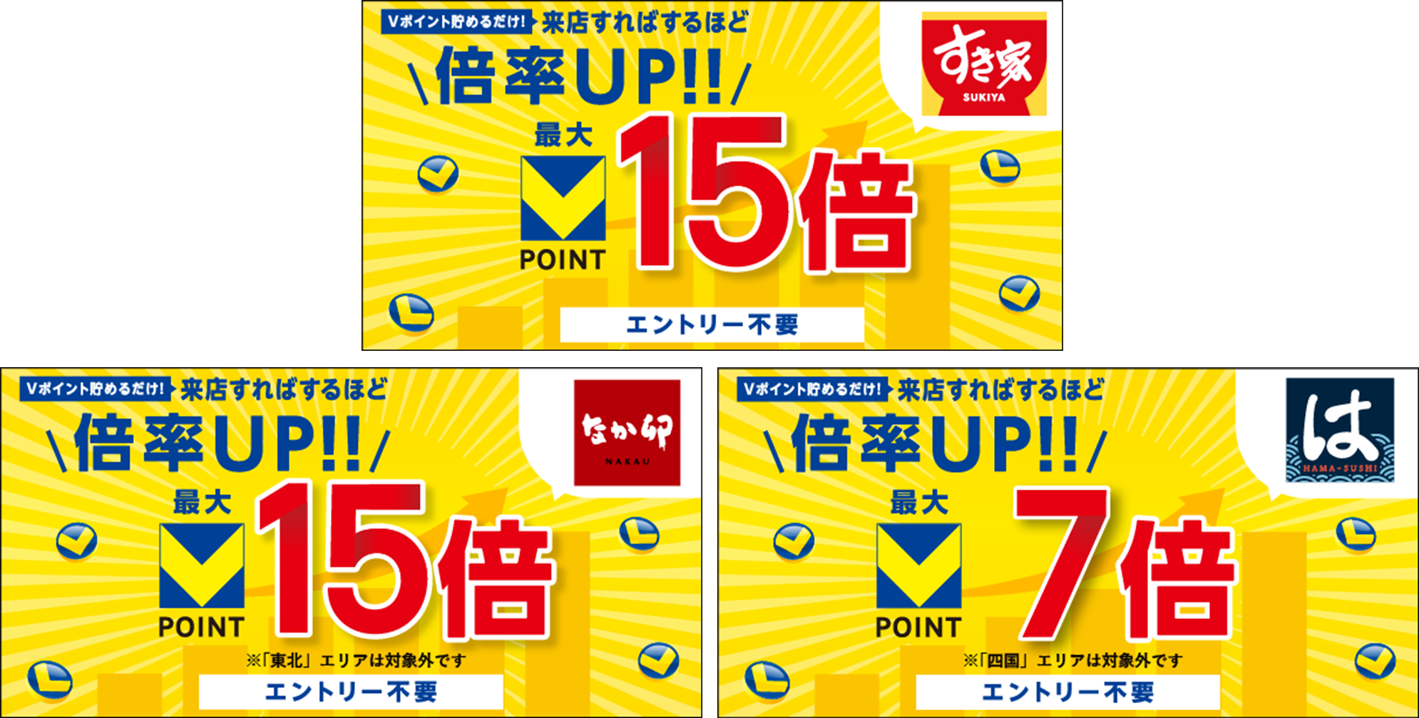 「すき家」「なか卯」「はま寿司」では、それぞれのこだわりが詰まった多彩なメニューを取り揃えております。Vポイントがお得に貯まるこの機会にぜひ「すき家」「なか卯」「はま寿司」でのお食事をお楽しみください。