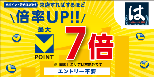 「はま寿司」では、来店回数に応じて最大7倍のVポイントを進呈いたします。キャンペーン期間中に2回来店で5倍、3回以上の来店で7倍のVポイントが貯まります。