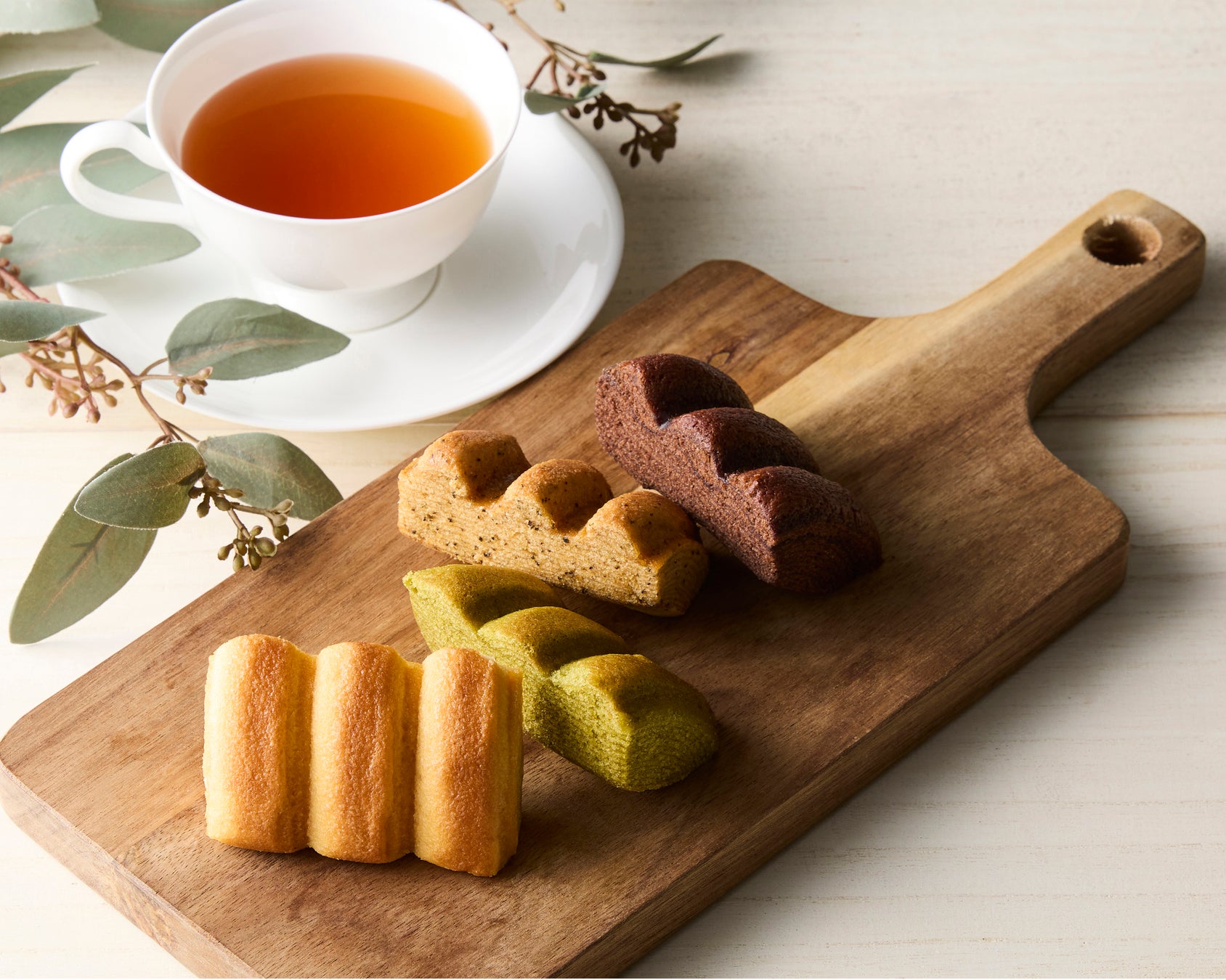 優しい味わいの「プレーン」に加え、新緑を思わせる「抹茶(春夏)」、落ち葉の季節を感じる「紅茶(秋)」、冬の温もりを届ける「ショコラ(冬)」と、季節の彩りを添えてお届けします。