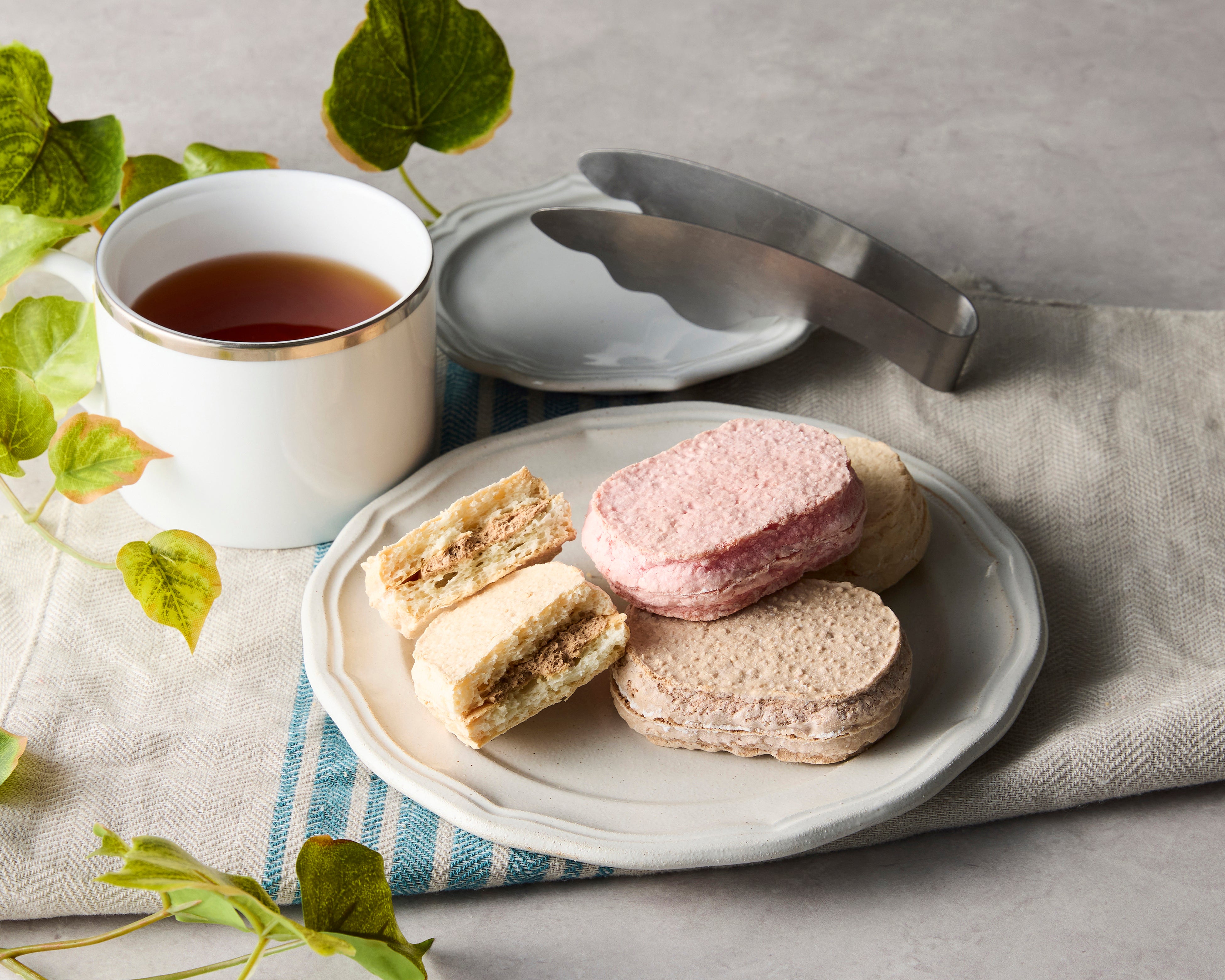 外はサクサク、中はふわふわに焼き上げたアーモンド風味豊かなメレンゲ生地が自慢のダックワーズです。「ヘーゼルナッツ」「塩キャラメル」「ストロベリーバニラ」の3種類のクリームをサンドし、それぞれの素材の香りを引き立てました。シェフのこだわりが詰まった、贅沢な食べ応えをお楽しみいただけます。