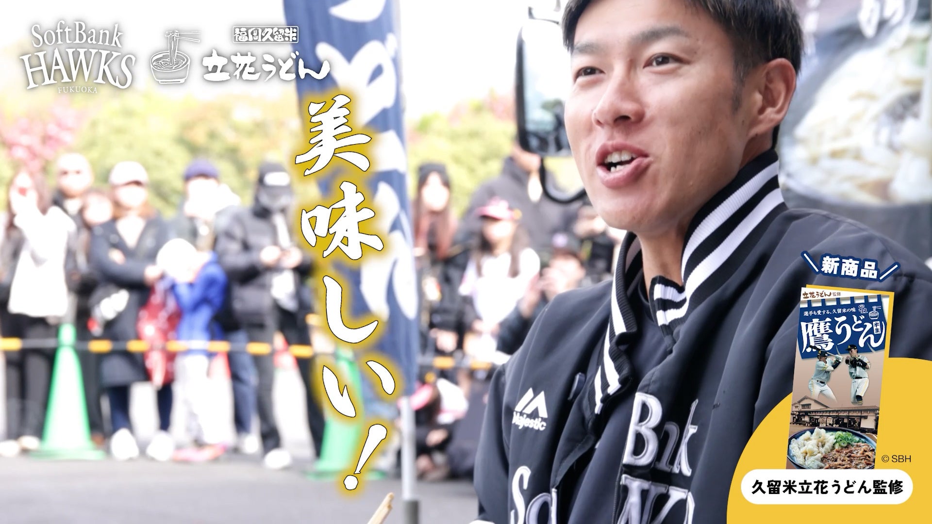 牧原大成選手と柳田悠岐選手が「鷹うどん」を試食する特別動画。動画内では、「県外の友達にも食べてもらいたい」、「出汁が美味しいです」といった感想を述べられ、「鷹うどん」の味わいを楽しむ様子をご覧いただけます。