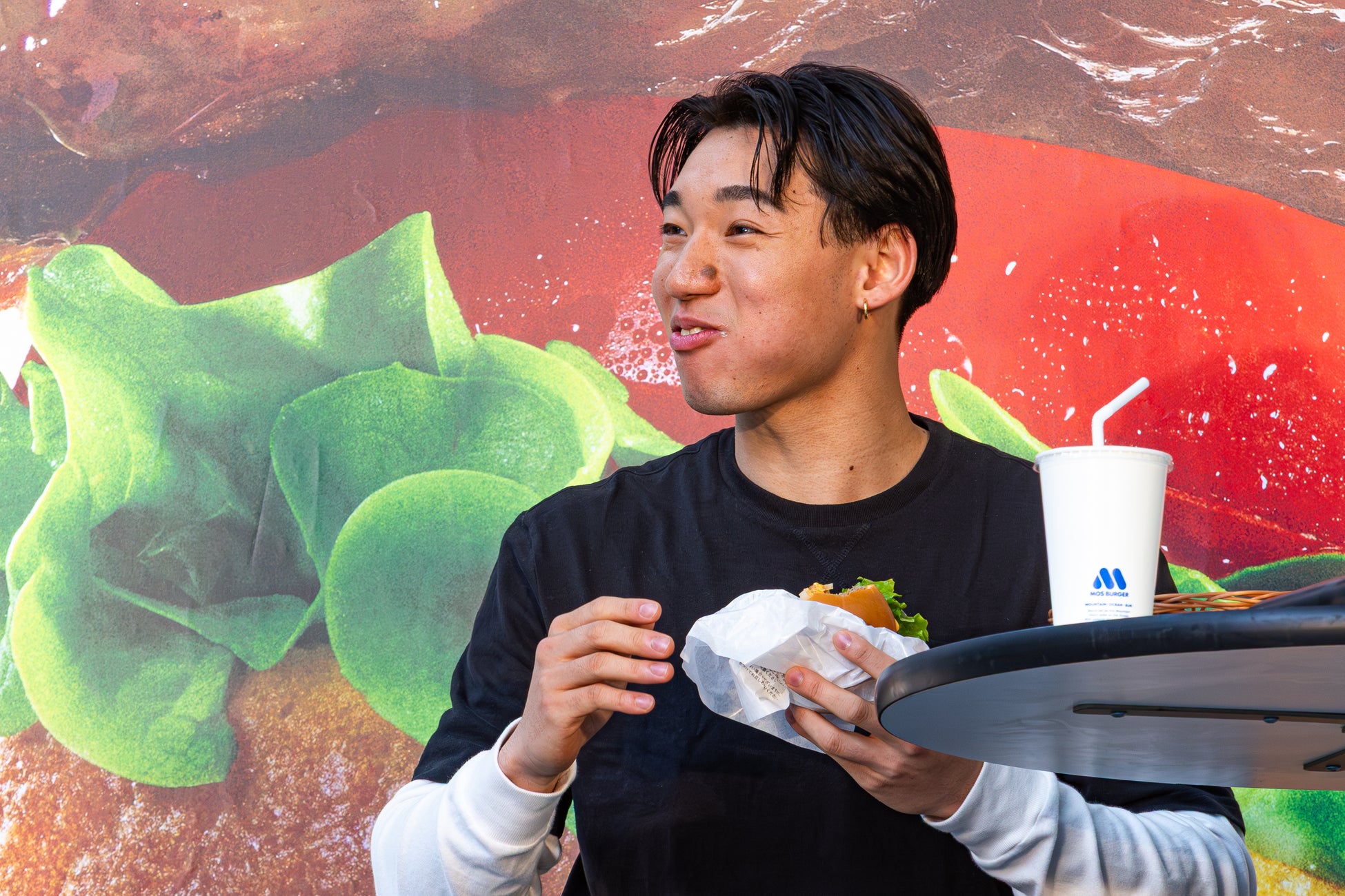 代表取締役社長の中村栄輔は、同社として初となるアクションスポーツアスリートへのサポートにあたって、「テリヤキなど画期的な商品をつくってきたモスのチャレンジ精神と、中村輪夢選手のチャレンジ精神をかけ合わせ、共に成長していきたいということで、今回契約をさせていただきました」と経緯を語りました。これに対し中村輪夢選手は、「今回お話をいただいて本当に嬉しかったです」と喜びを語りました。さらに、「こういう時はこのお店、というような感じでいろいろな店舗に行きます。ルーティンですね」と、普段からモスバーガーに通っていることを明かしました。