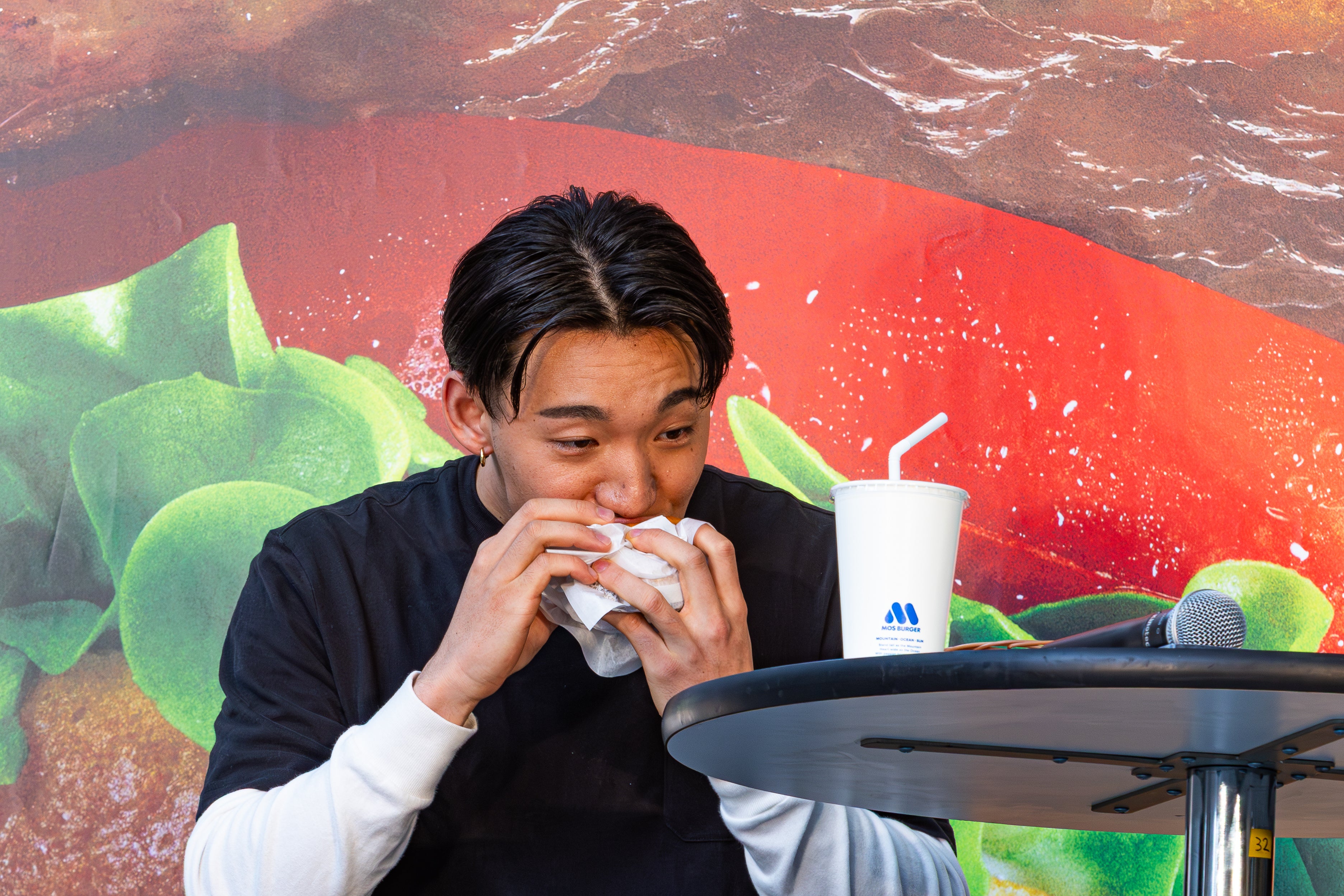 贈呈されたばかりの「MOS 食べ放題ゴールドカード」を使い、中村輪夢選手はその場で「とびきりチーズ ~北海道チーズ~」を注文。ステージに届けられた「とびきりチーズ」にかぶりついた中村輪夢選手は、国産牛100%使用のパティのボリュームと濃厚なチーズの香りに、「とびきりおいしいです!僕のお気に入りポイントは、やっぱりこの濃厚なチーズですね」と感想を語りました。