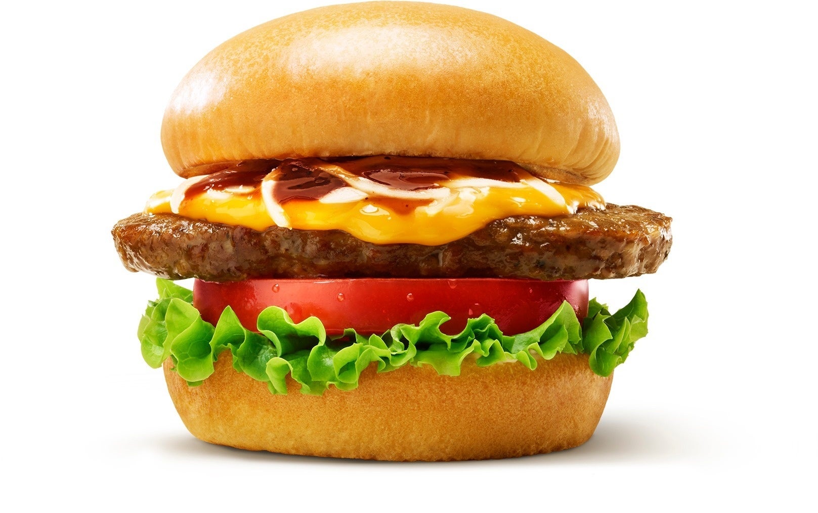 カロリーハーフマヨネーズタイプを塗ったバンズに、グリーン リーフとトマト、国産牛100%使用のパティ、北海道チーズをのせ、オニオンスライス、和風バーベキューソースを合わせました。パティは食べ応えがありながら、脂の旨みも楽しめるよう、肉と脂をバランスよく配合しています。食べ応えのあるパティには、燻製の香りが特徴の和風バーベキューソースと、ゴーダ、チェダー、パルメザンなど複数のチーズを使用した北海道チーズをバランスよく合わせました。国産牛パティの旨みと和風バーベキューソースのス モーキーな香り、そしてチーズの風味が食欲をそそる贅沢な一品です。
