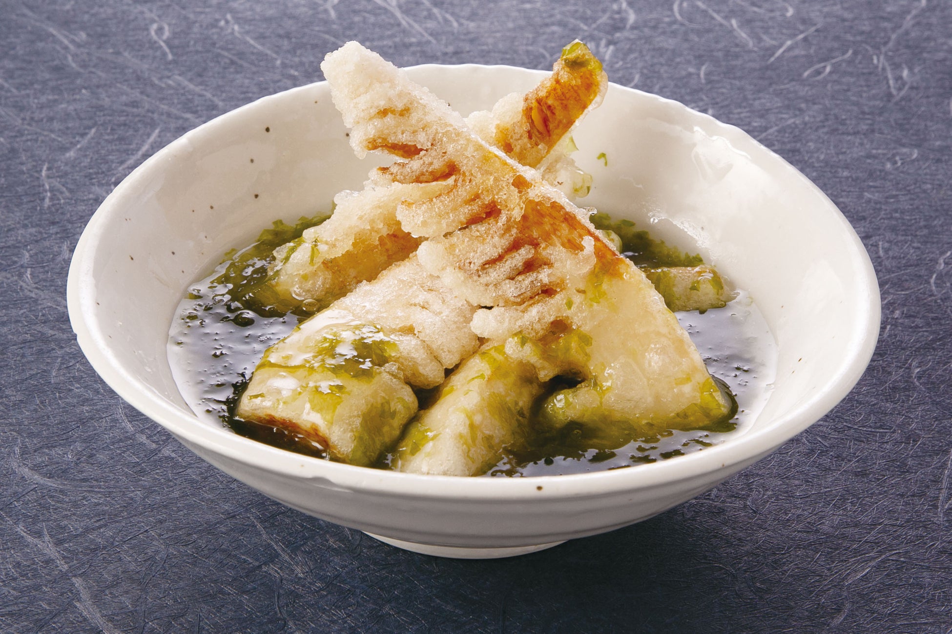 旬の筍にカツオ節をまとわせ、カラッと揚げました。特製・若芽マ