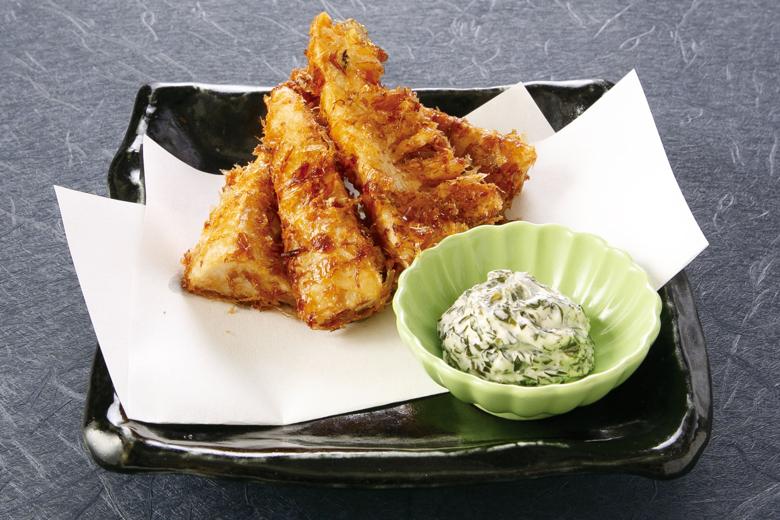 旬の筍にカツオ節をまとわせ、カラッと揚げました。特製・若芽マ