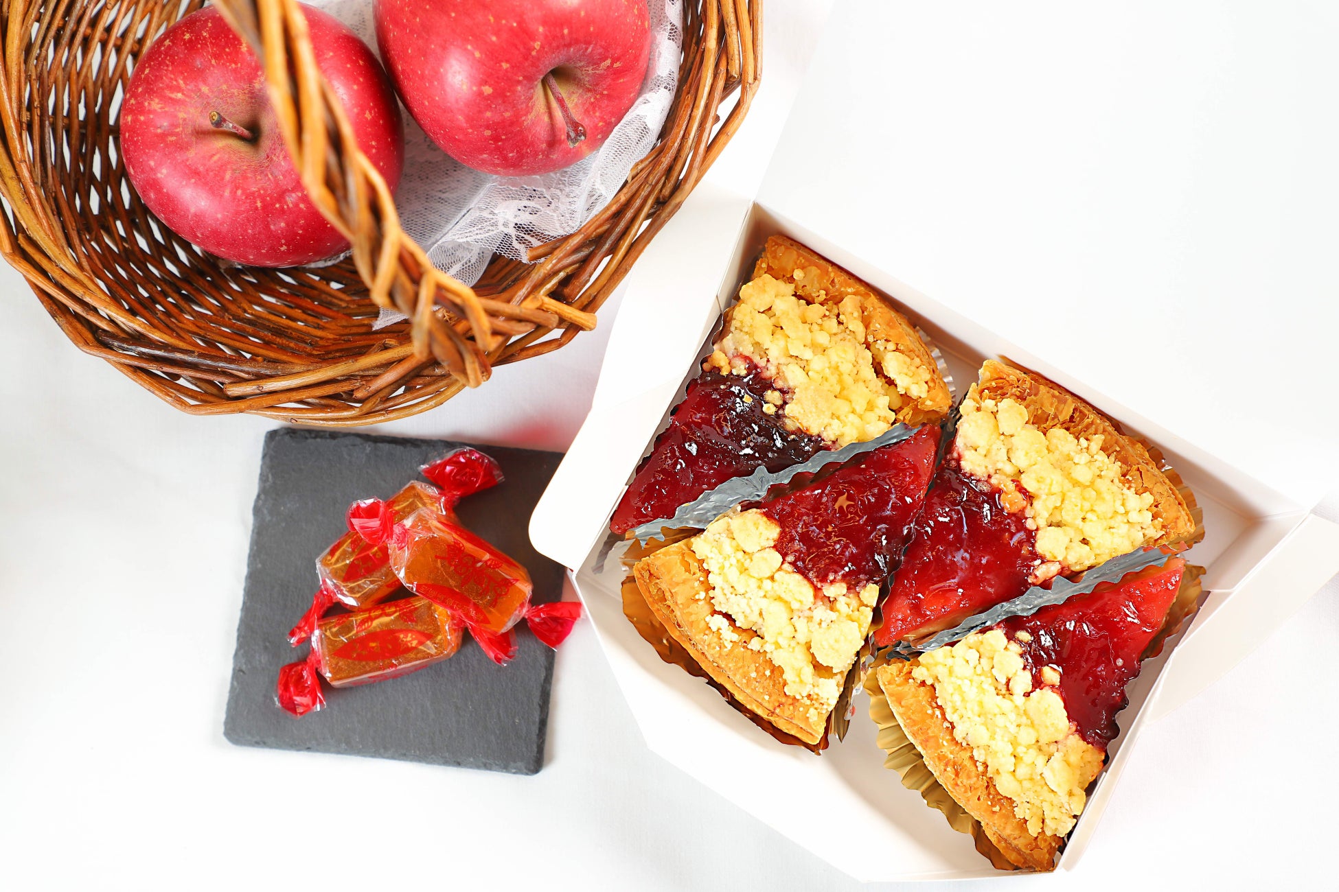 サクサクのパイ生地に、二層の自家製クリームとたっぷりのりんごを重ね、「四季のジャム」“すもも”と「みすゞ飴」をのせて焼き上げました。