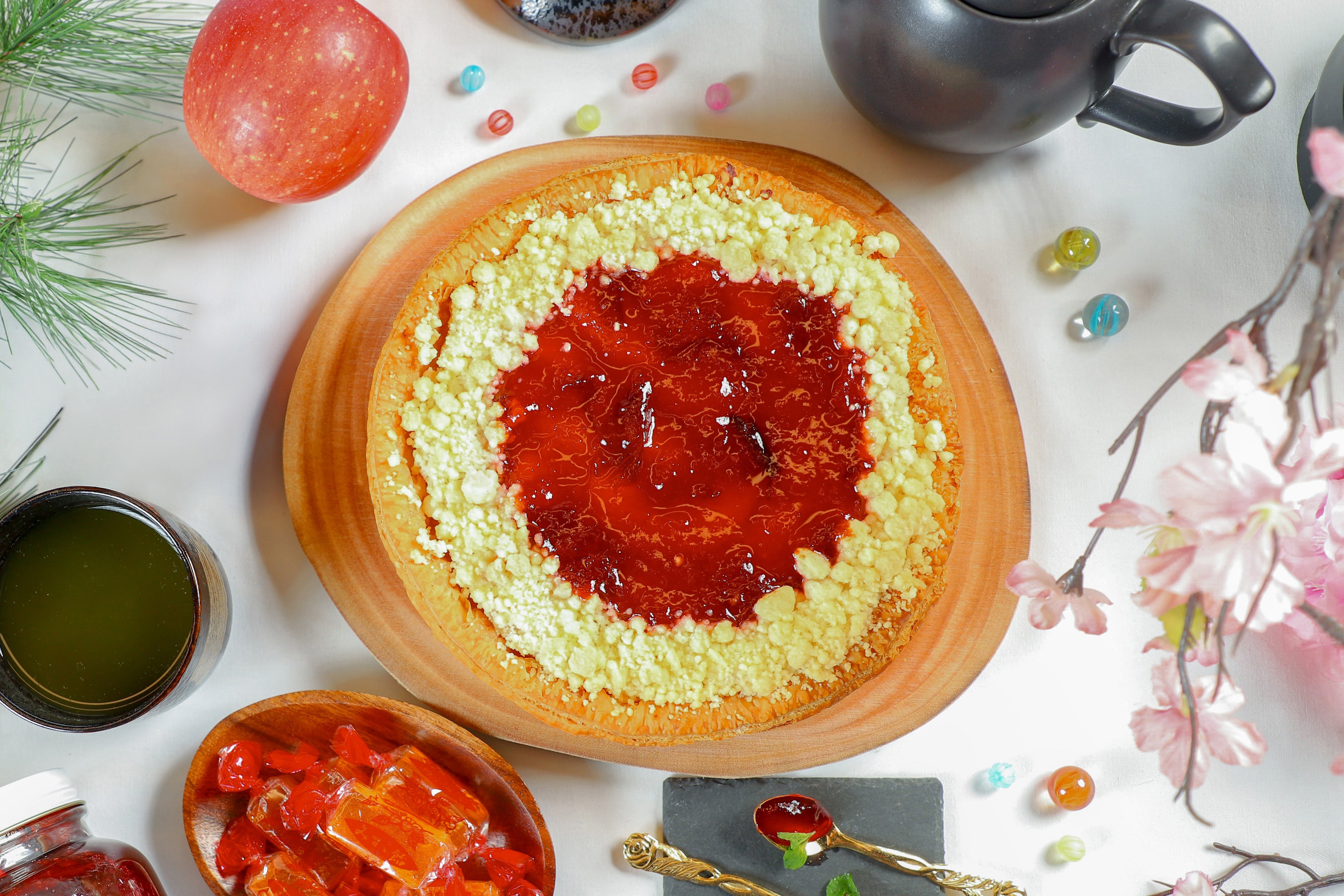 サクサクのパイ生地に、二層の自家製クリームとたっぷりのりんごを重ね、「四季のジャム」“すもも”と「みすゞ飴」をのせて焼き上げました。
