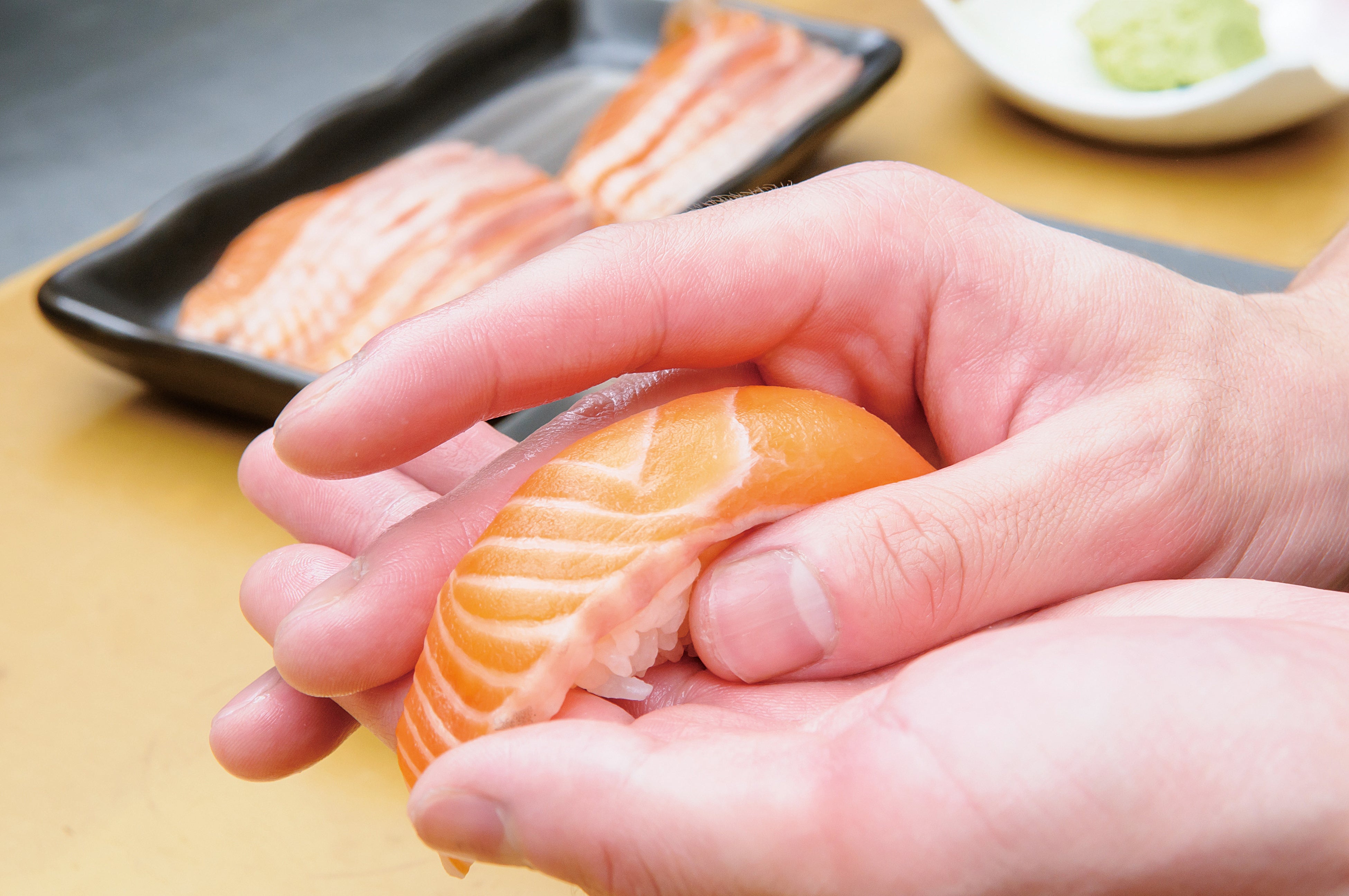 わさびの効いたタルタルソースで楽しむサーモン握りです。