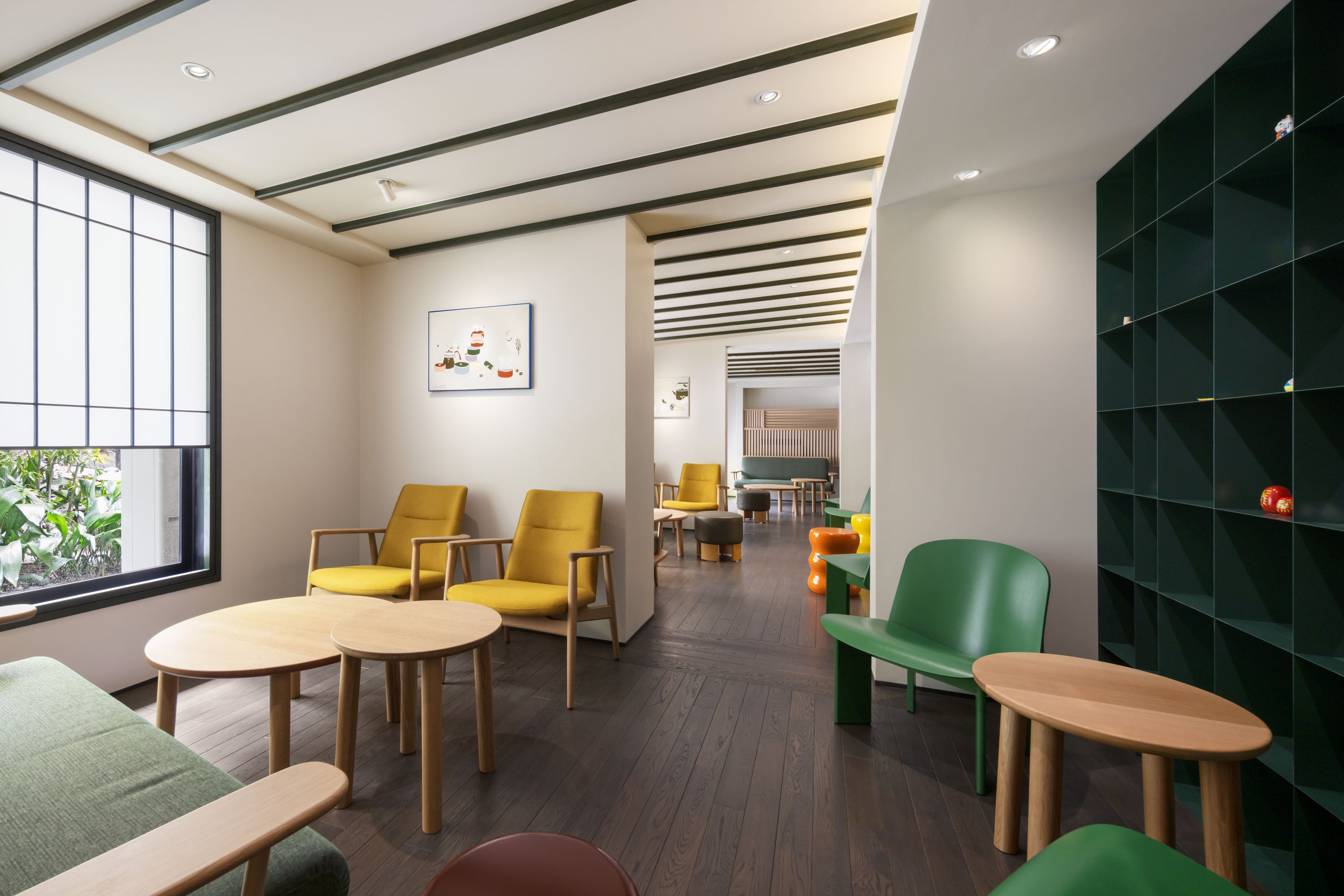 1階と地下1階の2つのフロアを要する日本家屋の店舗は、暖簾や行燈をしつらえ、お客様をお迎えします。暖簾をくぐると、京都の風情ある街並みの佇まいやスターバックスのハンドクラフト感、コーヒーのエッセンスを感じていただける空間が広がります。元々の建物を生かした店舗は、いくつかの空間にわかれており、1階には藤棚が目の前に見える小上がりの客席やフロアの中央にビッグテーブルを配置した席を用意。地元の方や旅行者など様々なお客様が自然とつながり、会話が生まれるような場をめざしました。地下1階はまるで茶屋を営む家族の自宅のようなフロア構成で、茶室・食卓・居間を思わせる空間に仕上げ、リラックスした時間を過ごしていただけます。店内には80席の様々な客席を用意し、近隣の寺社仏閣を巡った後の休憩など、その日の気分やシーンに合わせて、好きな席を見つけていただくのもこの店舗ならではの楽しみ方です。