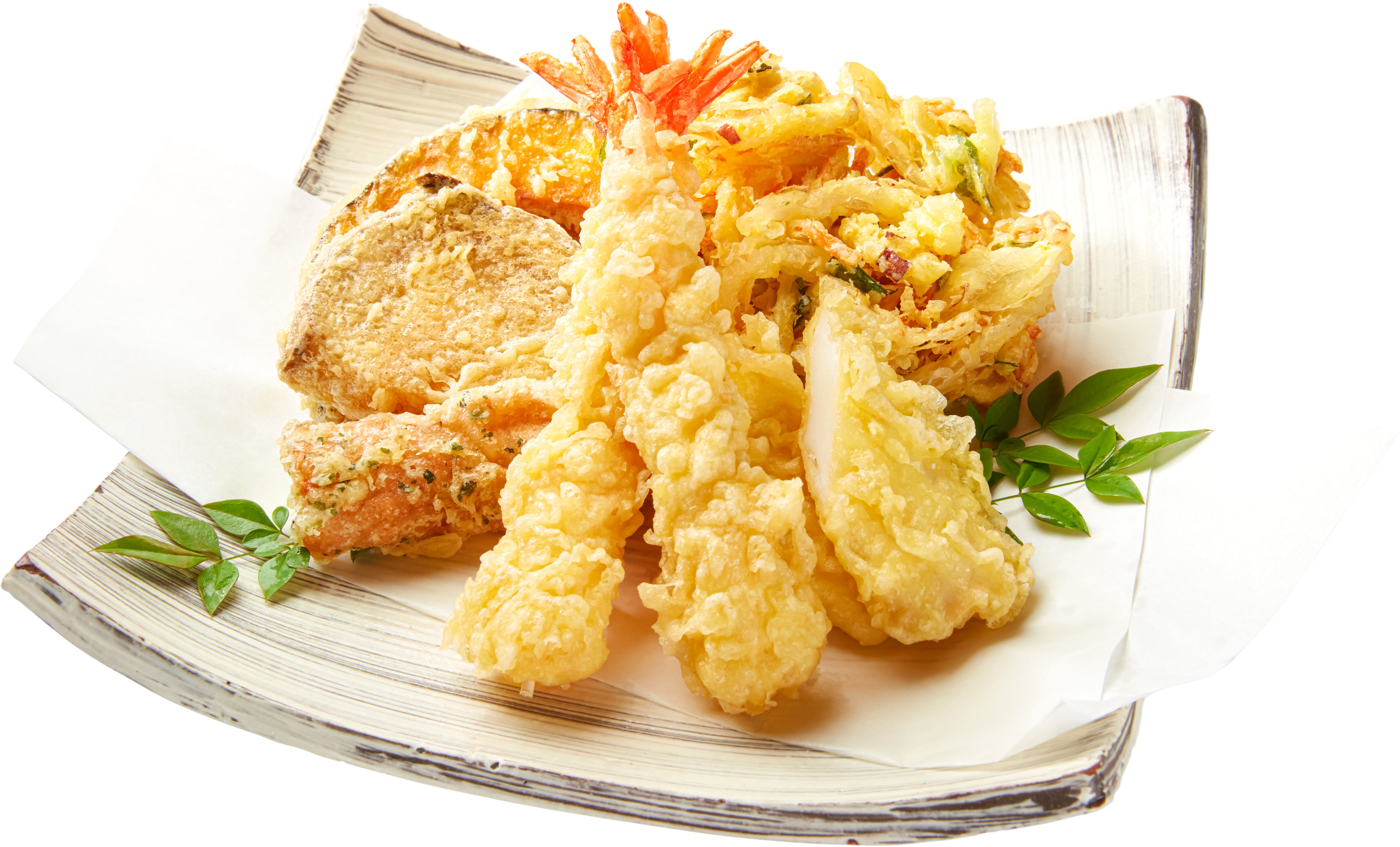 大海老天220円、いか天200円、とり天200円、野菜かき揚げ180円、ちくわ磯辺揚げ130円、