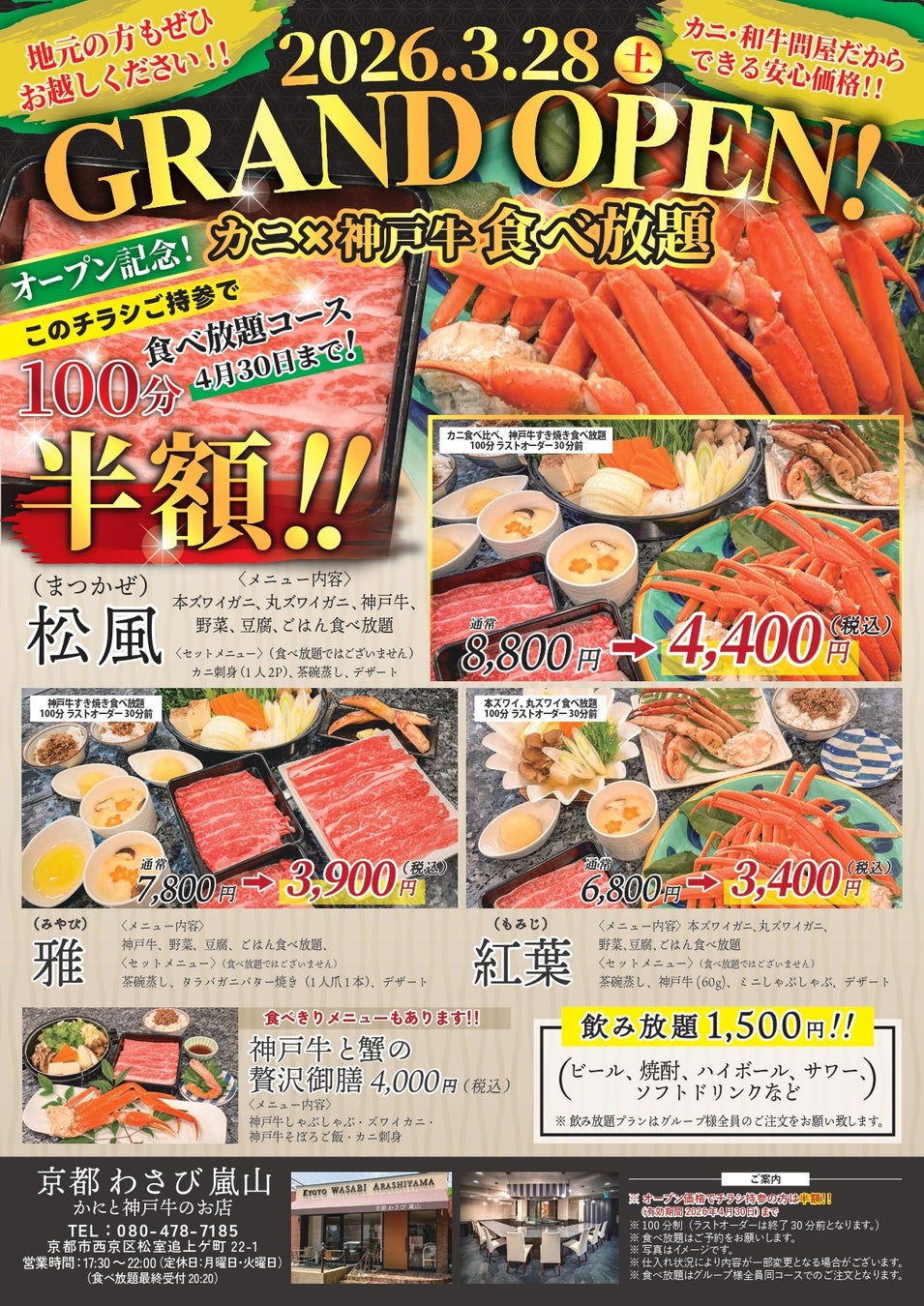 高速バス・夜行バス・日帰りバスツアー等を販売する株式会社平成エンタープライズ(本社:埼玉県志木市、代表取締役:田倉貴弥、https://busde.com/ )は、3月28日(土)より、「レストラン かにと和牛 富士山亭」(河口湖)と、かにと神戸牛のお店 京都わさび嵐山店(https://guesthousejp.com/arashiyama/ )の2店舗をオープンすることといたしました(当面は夜営業のみ)。どちらも観光地として国内外ともに人気のあるエリアですが、地元重視のかにと神戸牛専門店をオープンいたします。また、今回特別にオープンキャンペーンとして、チラシ持参の方は食べ放題コースが半額でお楽しみいただけます(4月末日まで)。