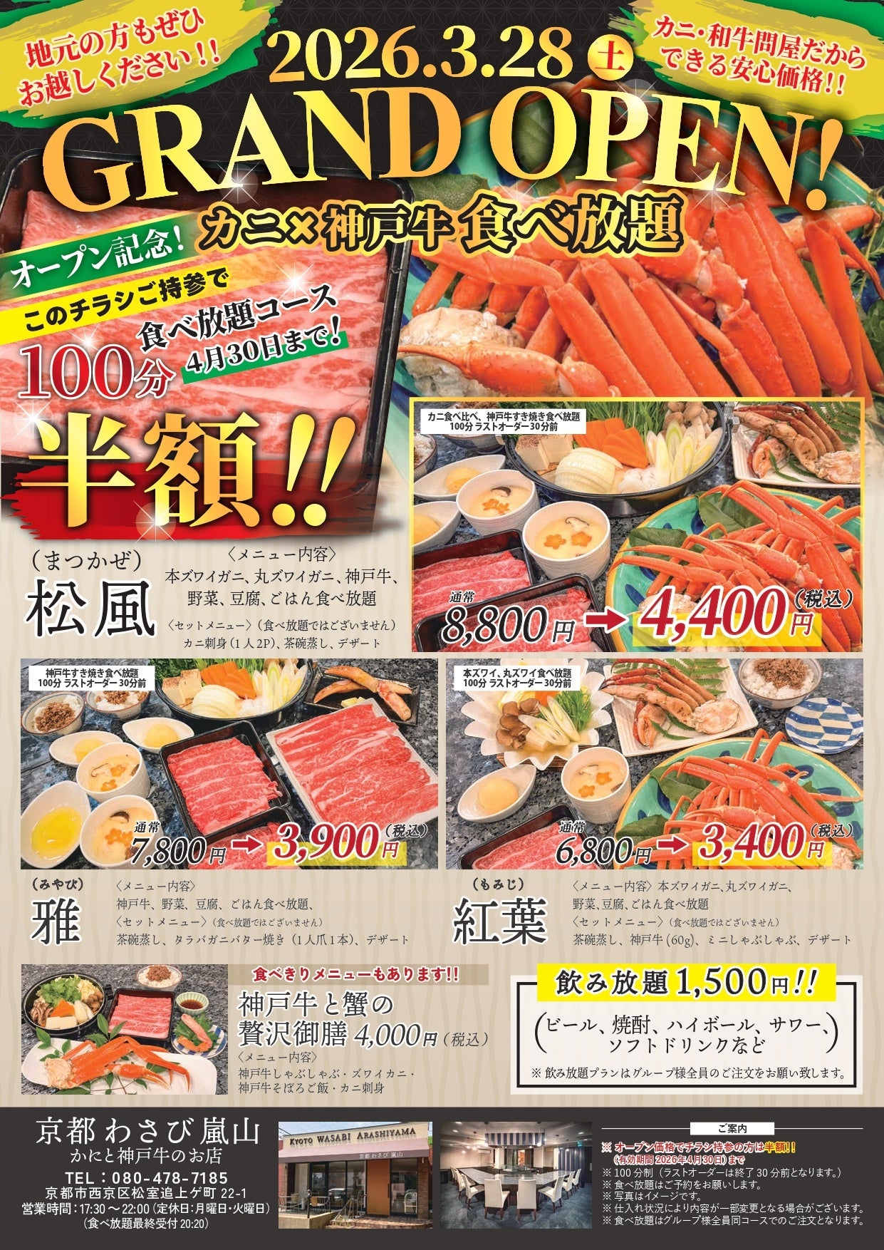 高速バス・夜行バス・日帰りバスツアー等を販売する株式会社平成エンタープライズ(本社:埼玉県志木市、代表取締役:田倉貴弥、https://busde.com/ )は、3月28日(土)より、「レストラン かにと和牛 富士山亭」(河口湖)と、かにと神戸牛のお店 京都わさび嵐山店(https://guesthousejp.com/arashiyama/ )の2店舗をオープンすることといたしました(当面は夜営業のみ)。どちらも観光地として国内外ともに人気のあるエリアですが、地元重視のかにと神戸牛専門店をオープンいたします。また、今回特別にオープンキャンペーンとして、チラシ持参の方は食べ放題コースが半額でお楽しみいただけます(4月末日まで)。