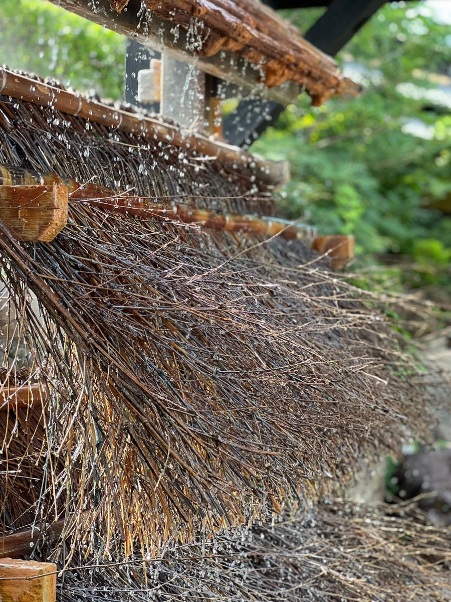 湯雨竹とは、高温の源泉を竹に通し、細かく分散させながら自然に冷ます装置です。