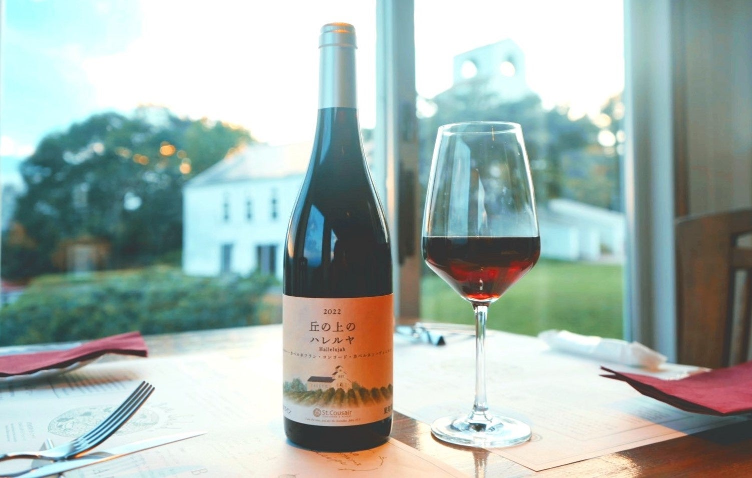 サンクゼールワイナリーのレストランとチャペルの前に広がる南向きの急斜面に位置する自社畑「チャペルヴィンヤード」。この畑のぶどうと、ほかの2つの自社畑で収穫されたぶどうを醸し、上品な果実味と奥深さが味わえるワインが生まれました。