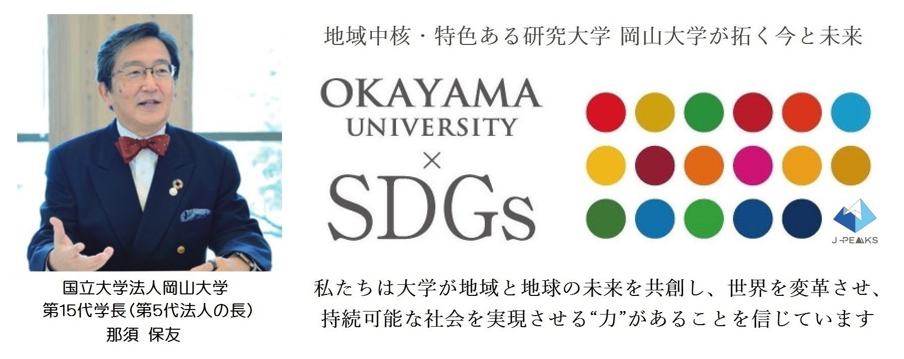 岡山大学 文部科学省「地域中核・特色ある研究大学強化促進事業(J-PEAKS)」に採択~地域と地球の未来を共創し、世界の革新の中核となる研究大学:岡山大学の実現を加速とともに世界に誇れる我が国の研究大学の山脈を築く~