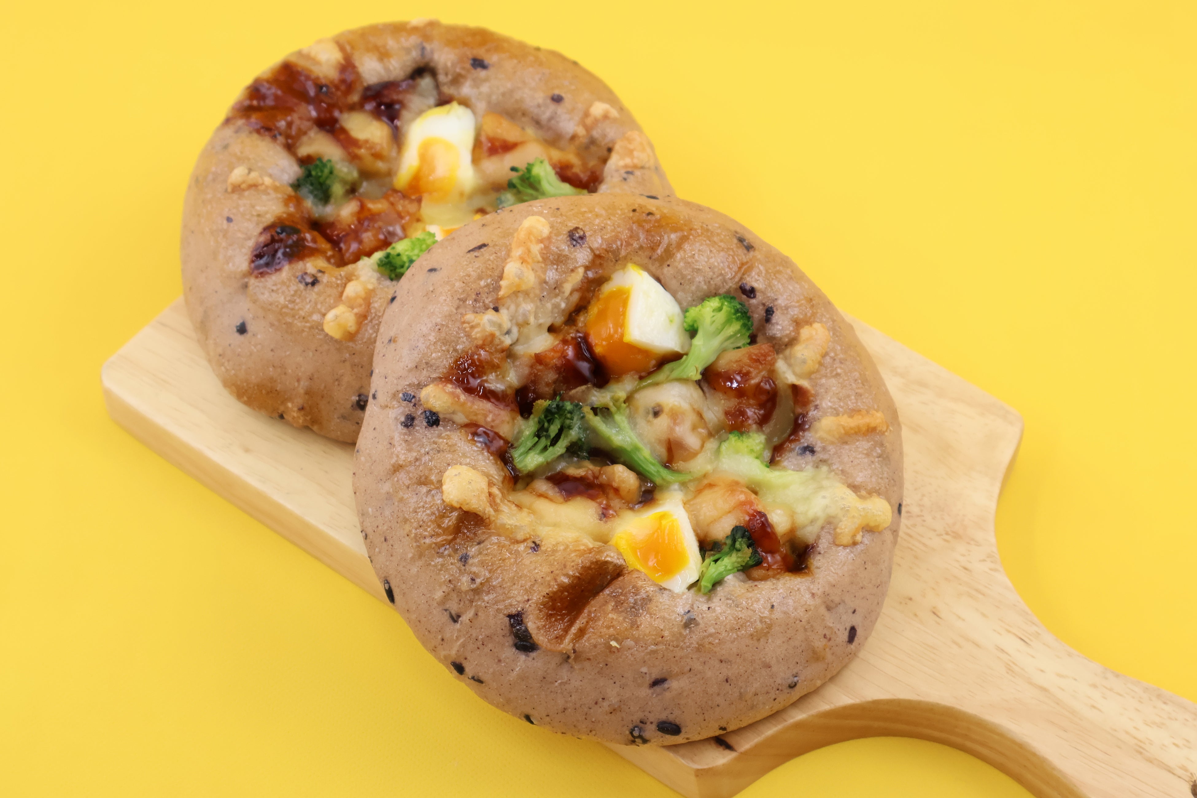 北海道産小麦を使用し、黒米を練り込んだ生地に、ローストチキンとまるコロたまごをのせ、照りのある甘辛だれをトッピングしました。彩り豊かで具沢山!食べ応えたっぷりで、心まで満たされるごちそうパンです。