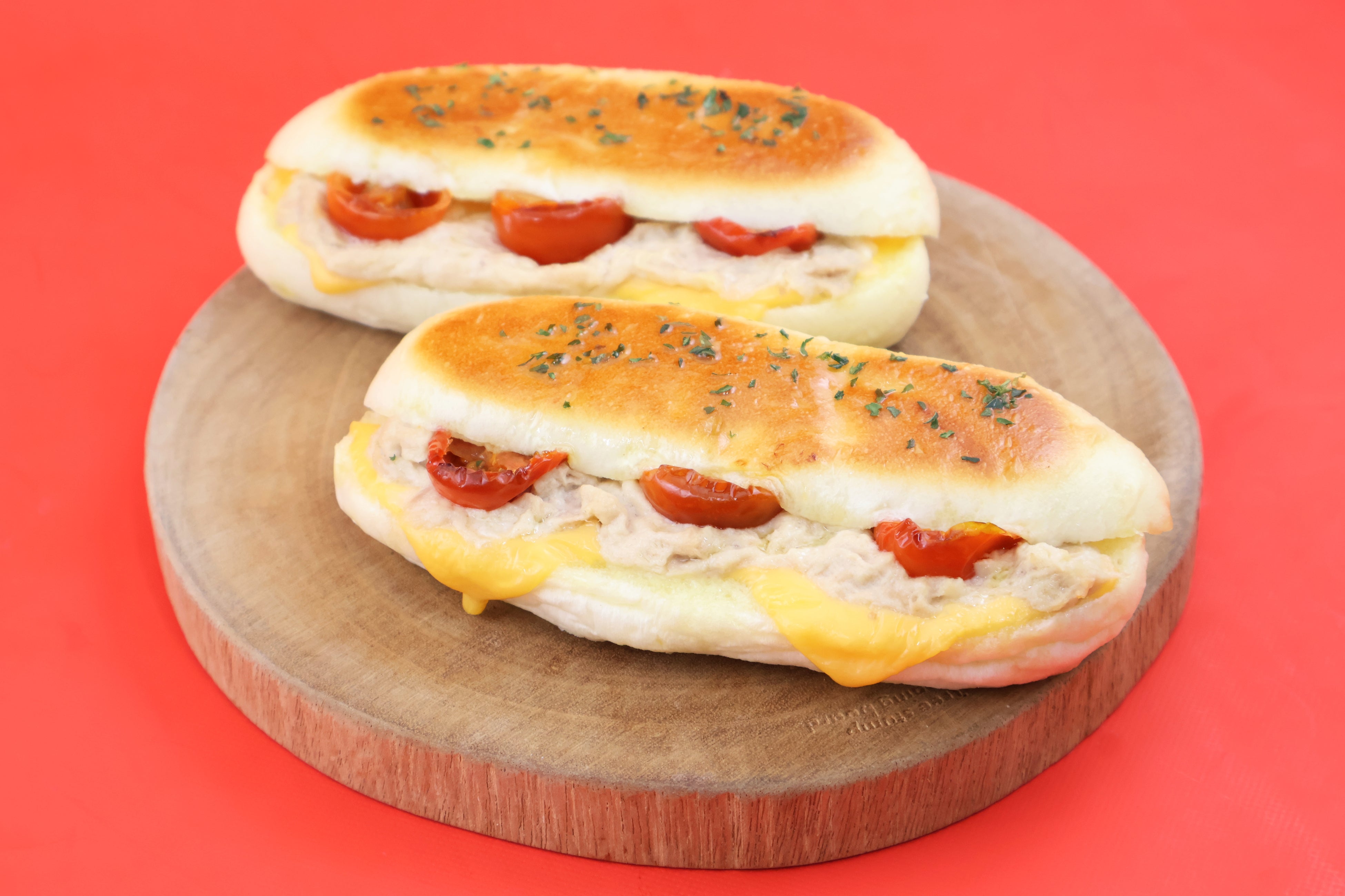 ふんわりとした食パン生地に、ツナサラダとチェリートマトを挟んで焼き上げました。シンプルだからこそ、ツナの美味しさがしっかり引き立つパニーニ。甘酸っぱいチェリートマトがアクセントです。