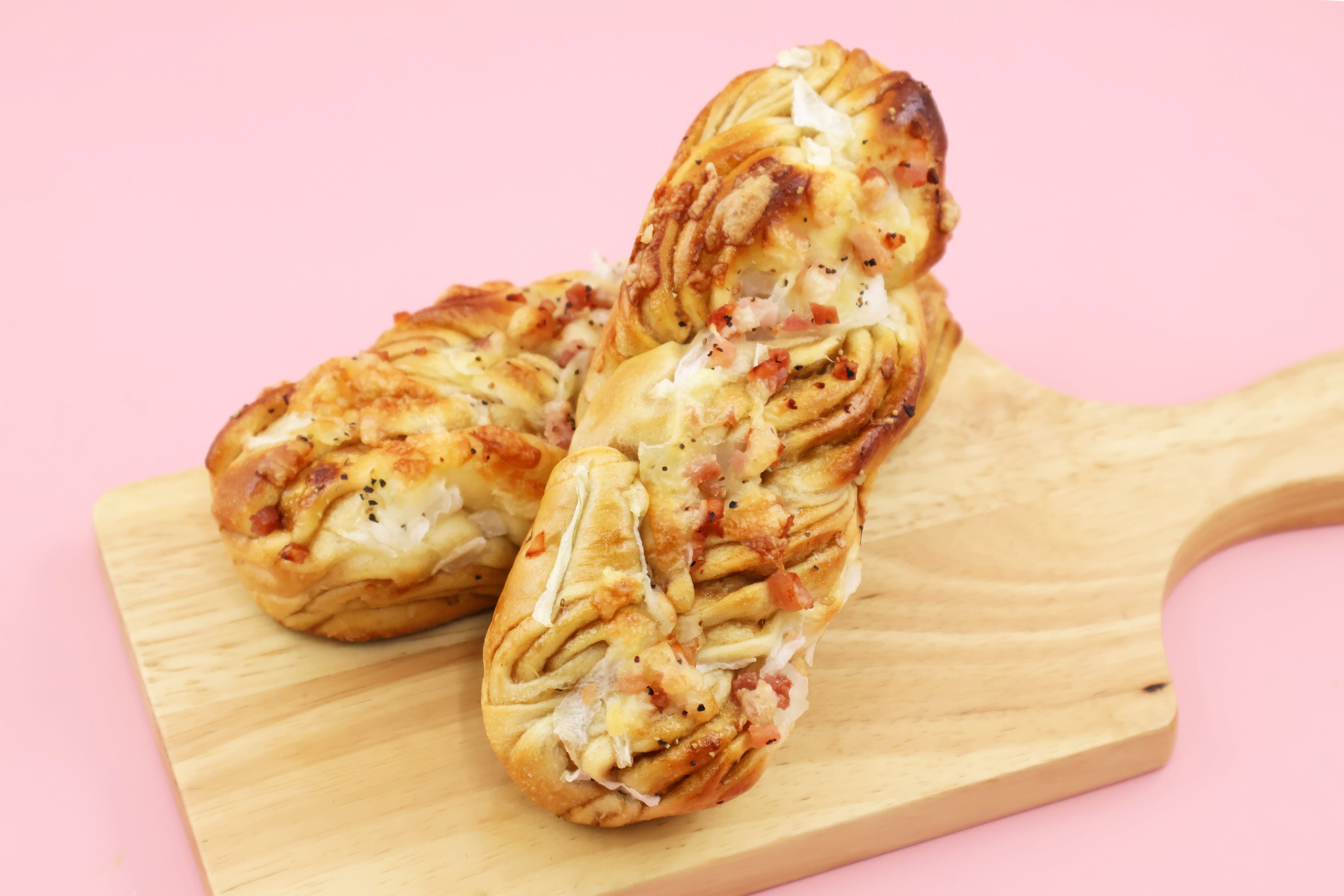 北海道オニオン使用のフィリングを折り込んだ生地に、スライスたまねぎとベーコンをのせて焼き上げました。焼き上げることで引き出されたたまねぎの濃厚な甘みと、ベーコンの香ばしい塩気が絶妙にマッチ!ひとくちごとに旨みが広がる、大満足のスティックパンです。