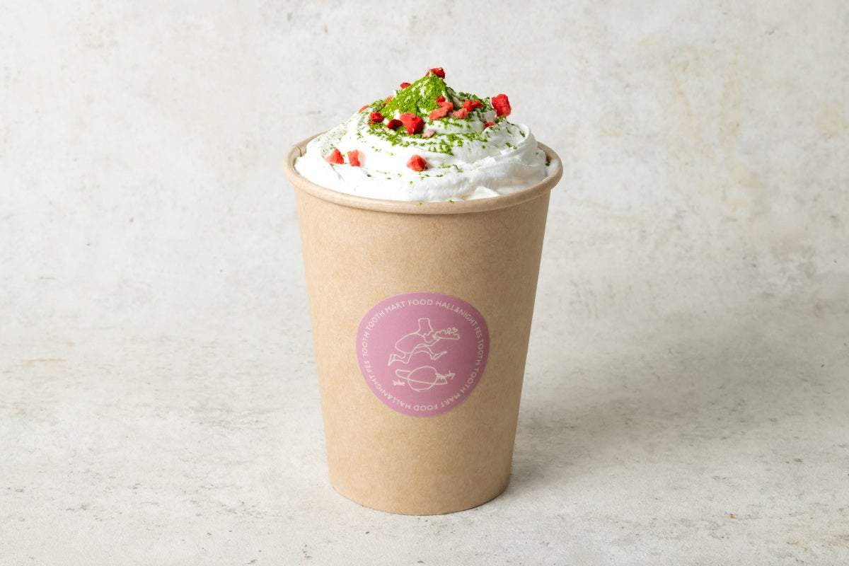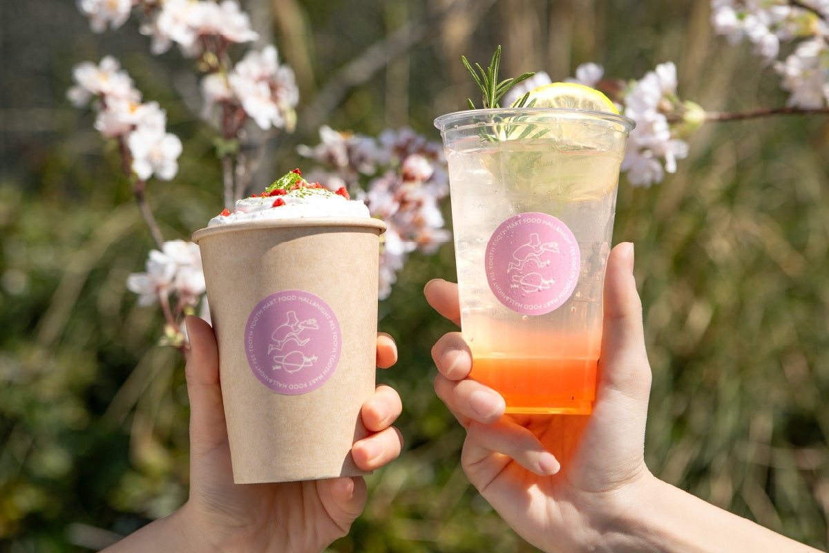 ピンク色のロゴが可愛い今年のスイーツドリンクは、鮮やかな桜色のレモネードとホッとあたたまる抹茶オレの2種類。桜をバックに手に取って写真を撮っていただくのもおすすめです♪