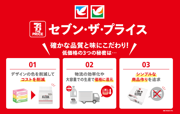 近年、長引く物価高騰を背景に商品の値上げが続く中、お客様の「価格」に対する関心は一段と高まっています。こうした状況を受け、イトーヨーカドーでは、確かな品質と味にこだわりながら、「パッケージの効率化・共通化」、「物流・生産体制の集約・効率化」、「シンプルな商品づくり」といった取り組みを通じて、お買い得価格を実現する低価格PB『セブン・ザ・プライス』の展開を強化しています。