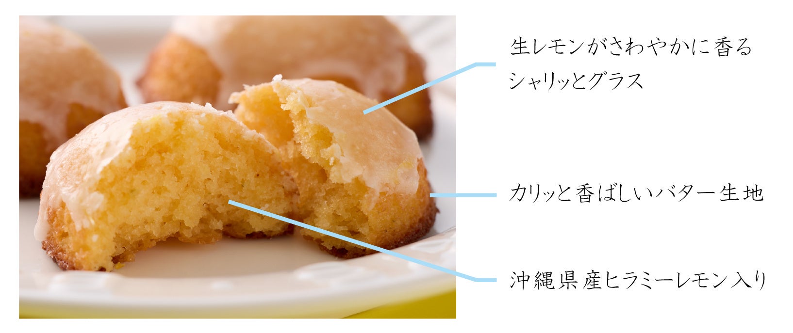 沖縄でレモンケーキはお正月や旧盆、清明祭(シーミー)など、大事な行事のお供え菓子として欠かせないお菓子です。生レモンケーキは、フレッシュバターを贅沢に使った生地に沖縄県産のヒラミーレモン果汁と果皮を混ぜ込み、酸味の中にも程よいほろ苦さを残しました。商品名の通り、仕上げのグラスにはフレッシュな生レモンから絞った果汁とすりおろした果皮を加えました。生地本来の味わいを引き立てつつさわやかな甘みをプラスし、薄くコーティングすることでシャリッと食感でバランスの良い美味しさに仕上げました。