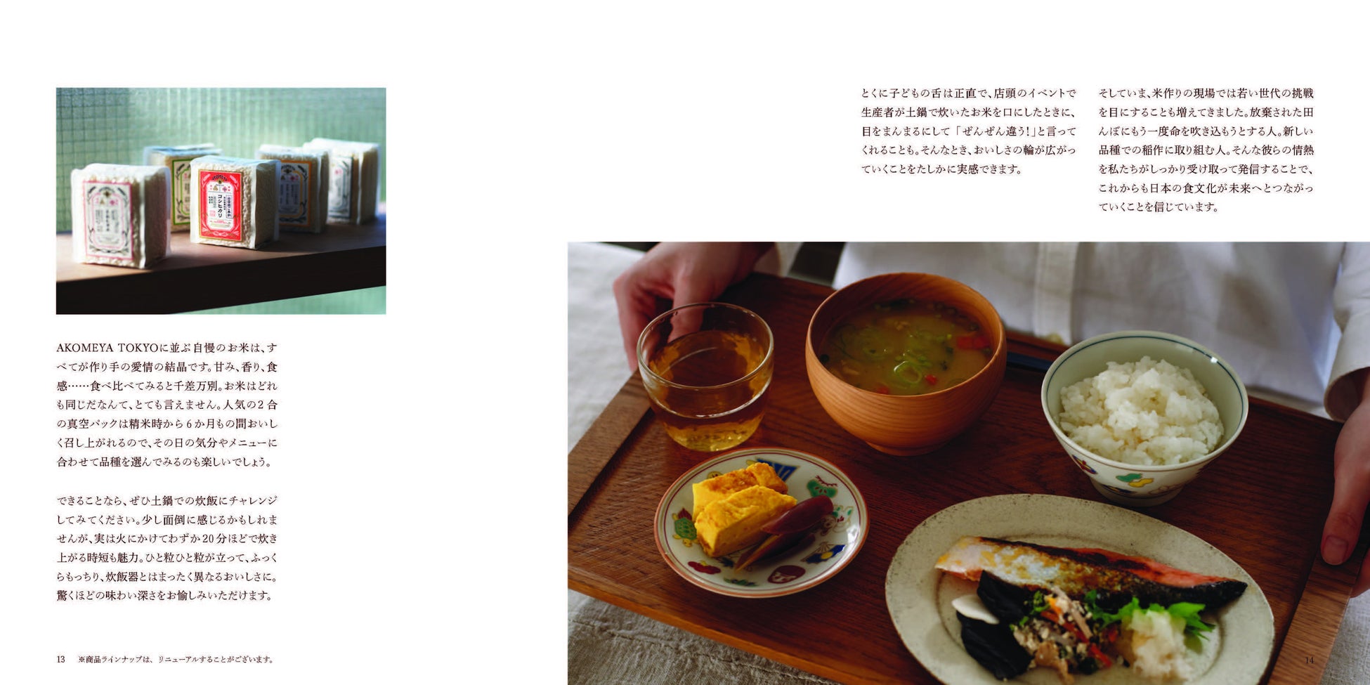 お米のこだわりをはじめ、生産者とのつながり、商品の背景にあるストーリーをカテゴリー毎に掲載。さらに、道具のお手入れ方法や商品をより楽しめる様々なレシピなど、暮らしを豊かにするヒントも多彩に紹介しています。読み物としても楽しめる、長く手元に置いておきたくなる1冊です。