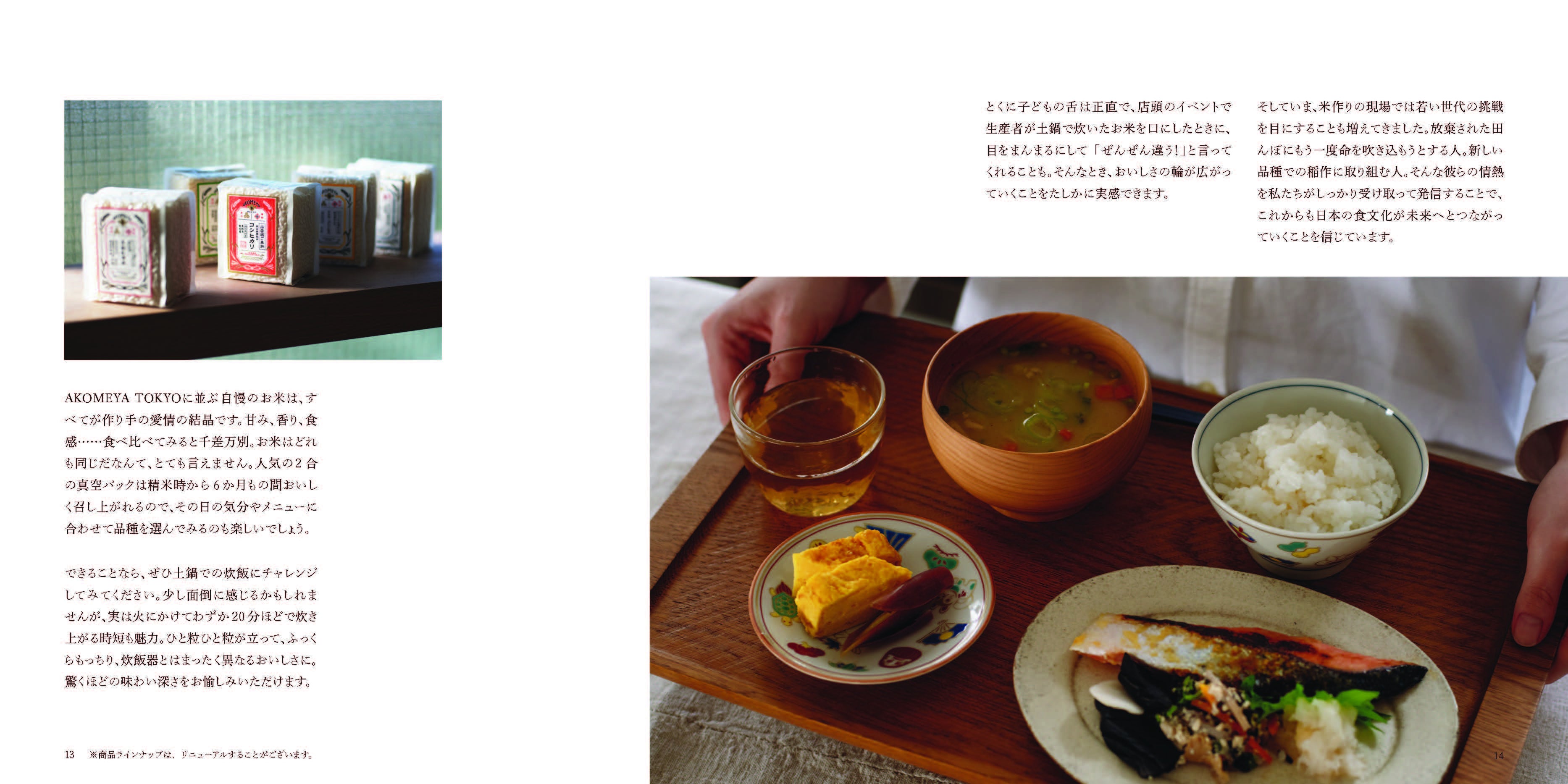 お米のこだわりをはじめ、生産者とのつながり、商品の背景にあるストーリーをカテゴリー毎に掲載。さらに、道具のお手入れ方法や商品をより楽しめる様々なレシピなど、暮らしを豊かにするヒントも多彩に紹介しています。読み物としても楽しめる、長く手元に置いておきたくなる1冊です。